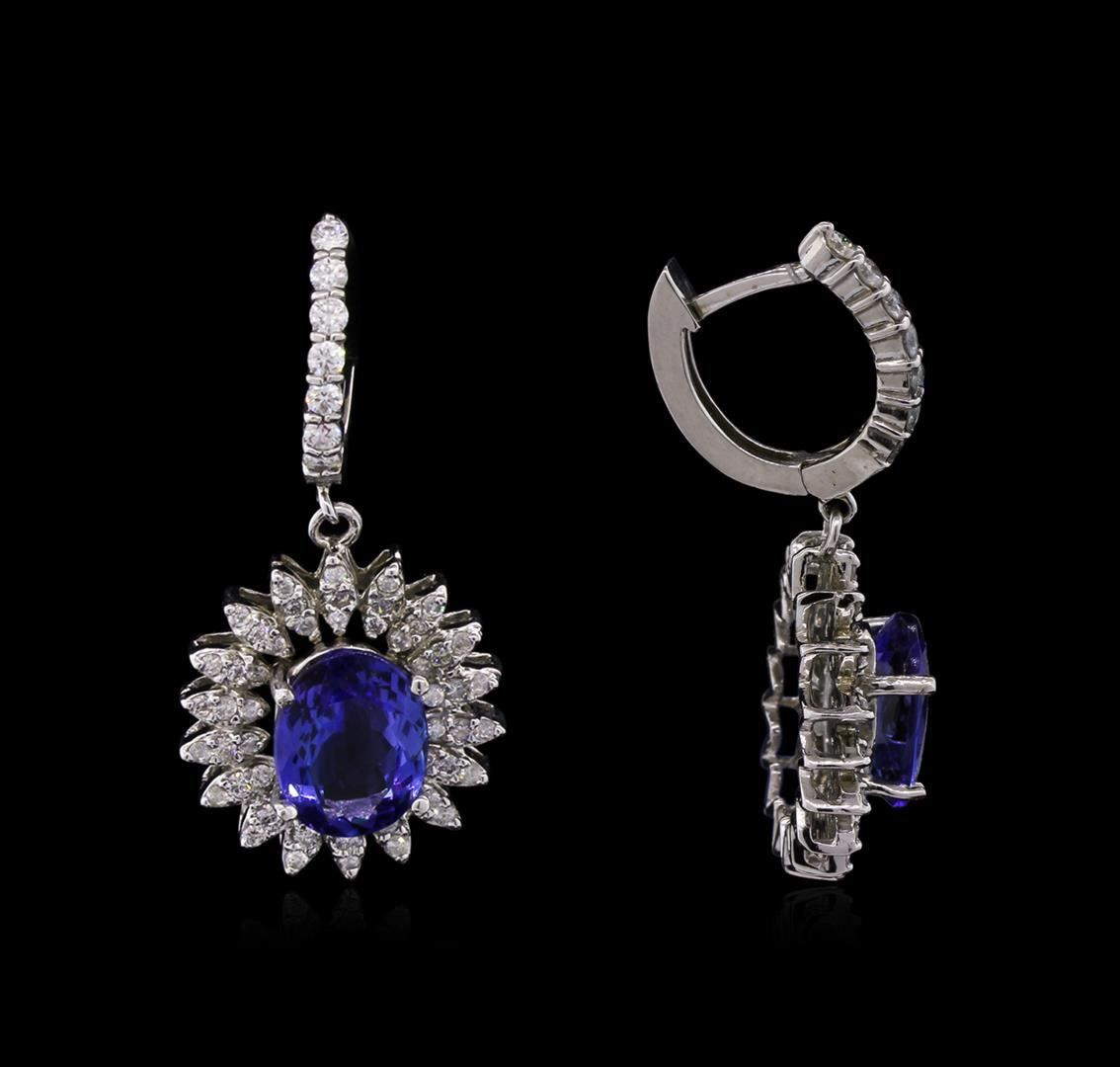One pair electronically tested 14KT white gold ladies cast tanzanite and diamond earrings with hinged clip backs with a bright polish finish. Identified with markings of "14K". Condition is new. Containing: Two prong set oval modified brilliant cut natural tanzanites, measuring 10.47 x 7.35 x 3.77mm, approximate total weight of 4.08ct., clarity is eye clean, type I, medium light, very slightly grayish, violet color, (GIA V 4/3), cut is good. One Hundred Twenty-Two prong set round brilliant cut diamonds, measuring 1.40 - 1.30 x 0.81mm (depth est.) approximate total weight of 122 Stones = 1.10ct. Clarity: SI-2 to I-1. Color: H - I, Cut is Good. Colored gemstones are presumed to have been subjected to commonly used enhancement processes. All diamonds and colored gemstones are graded in the mounting, unless otherwise stated. Total Weight of Colored Stones 4.08ct. Total Weight of Diamonds 1.10ct. Total Weight of Earrings 8.10 grams. GGL Appraised at $6,505.00.