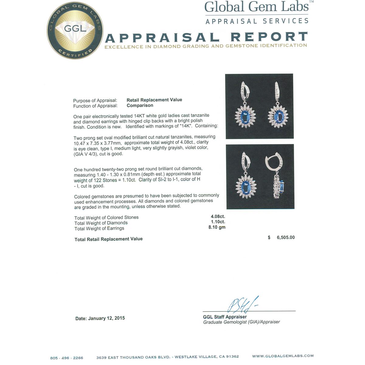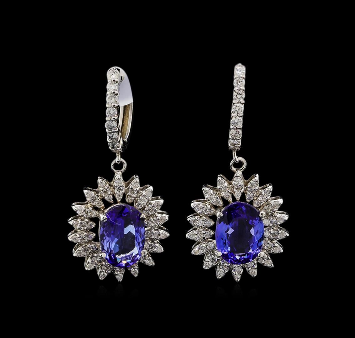 One pair electronically tested 14KT white gold ladies cast tanzanite and diamond earrings with hinged clip backs with a bright polish finish. Identified with markings of "14K". Condition is new. Containing: Two prong set oval modified brilliant cut natural tanzanites, measuring 10.47 x 7.35 x 3.77mm, approximate total weight of 4.08ct., clarity is eye clean, type I, medium light, very slightly grayish, violet color, (GIA V 4/3), cut is good. One Hundred Twenty-Two prong set round brilliant cut diamonds, measuring 1.40 - 1.30 x 0.81mm (depth est.) approximate total weight of 122 Stones = 1.10ct. Clarity: SI-2 to I-1. Color: H - I, Cut is Good. Colored gemstones are presumed to have been subjected to commonly used enhancement processes. All diamonds and colored gemstones are graded in the mounting, unless otherwise stated. Total Weight of Colored Stones 4.08ct. Total Weight of Diamonds 1.10ct. Total Weight of Earrings 8.10 grams. GGL Appraised at $6,505.00.