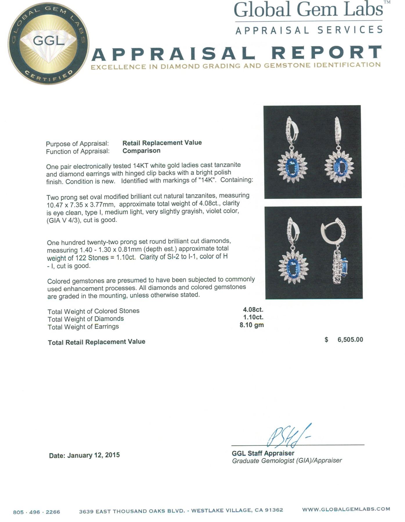 One pair electronically tested 14KT white gold ladies cast tanzanite and diamond earrings with hinged clip backs with a bright polish finish. Identified with markings of "14K". Condition is new. Containing: Two prong set oval modified brilliant cut natural tanzanites, measuring 10.47 x 7.35 x 3.77mm, approximate total weight of 4.08ct., clarity is eye clean, type I, medium light, very slightly grayish, violet color, (GIA V 4/3), cut is good. One Hundred Twenty-Two prong set round brilliant cut diamonds, measuring 1.40 - 1.30 x 0.81mm (depth est.) approximate total weight of 122 Stones = 1.10ct. Clarity: SI-2 to I-1. Color: H - I, Cut is Good. Colored gemstones are presumed to have been subjected to commonly used enhancement processes. All diamonds and colored gemstones are graded in the mounting, unless otherwise stated. Total Weight of Colored Stones 4.08ct. Total Weight of Diamonds 1.10ct. Total Weight of Earrings 8.10 grams. GGL Appraised at $6,505.00.
