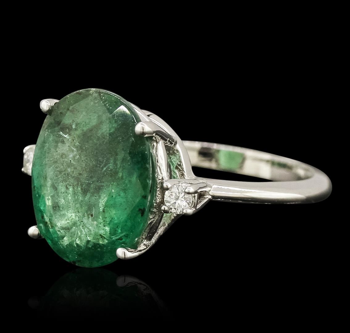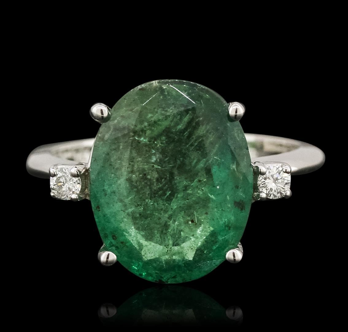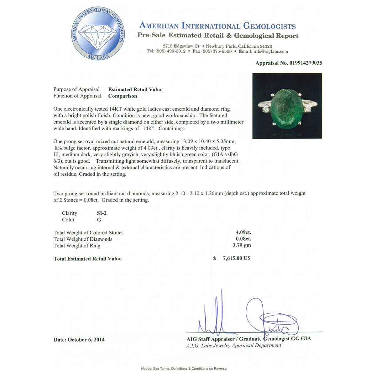 One electronically tested 14KT white gold ladies cast emerald and diamond ring with a bright polish finish. The featured emerald is accented by a single diamond on either side, completed by a two millimeter wide band. Identified with markings of "14K". Condition is new, good workmanship. Containing: One prong set oval mixed cut natural emerald, measuring 13.09 x 10.40 x 5.05mm, 8%. bulge factor, approximate weight of 4.09ct., clarity is heavily included, type III, medium dark, very slightly grayish, very slightly bluish green color, (GIA vslbG 6/3), cut is good. Transmitting light somewhat diffusely, transparent to translucent. Naturally occurring internal & external characteristics are present. Indications of oil residue. Graded in the setting. Two prong set round brilliant cut diamonds, measuring 2.10 - 2.10 x 1.26mm (depth est.) approximate. Total Weight of 2 Stones = 0.08ct. Graded in the setting. Clarity: SI-2. Color: G. Total Weight of Colored Stones 4.09ct. Total Weight of Diamonds 0.08ct. Total Weight of Ring 3.79gm. AIG Appraised at $7,615.00.