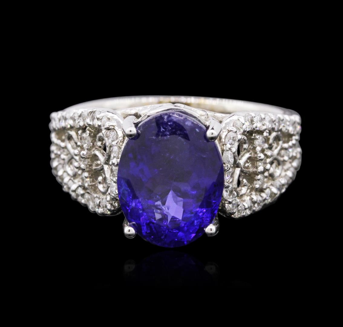 One electronically tested 14KT white gold ladies cast tanzanite and diamond ring with a bright polish finish. Identified with markings of "K14". Condition is new. Containing: One prong set rectangular cushion modified brilliant cut natural tanzanite, measuring 10.79 x 8.39 x 5.75mm, approximate weight of 4.10ct., clarity is moderately included, type I, medium, moderately strong, violetish blue color, (GIA vB 5/4), cut is good. Fifty-Eight prong set round brilliant cut diamonds, measuring 1.30 - 1.30 x 0.78mm (depth est.) approximate total weight of 58 Stones = 0.46ct. Clarity: SI-1 to SI-2. Color: H - I, Cut is Good. Colored gemstones are presumed to have been subjected to commonly used enhancement processes. All diamonds and colored gemstones are graded in the mounting, unless otherwise stated. Total Weight of Colored Stones 4.10ct. Total Weight of Diamonds 0.46ct. Total Weight of Ring 5.90 grams. GGL Appraised at $5,420.00.
