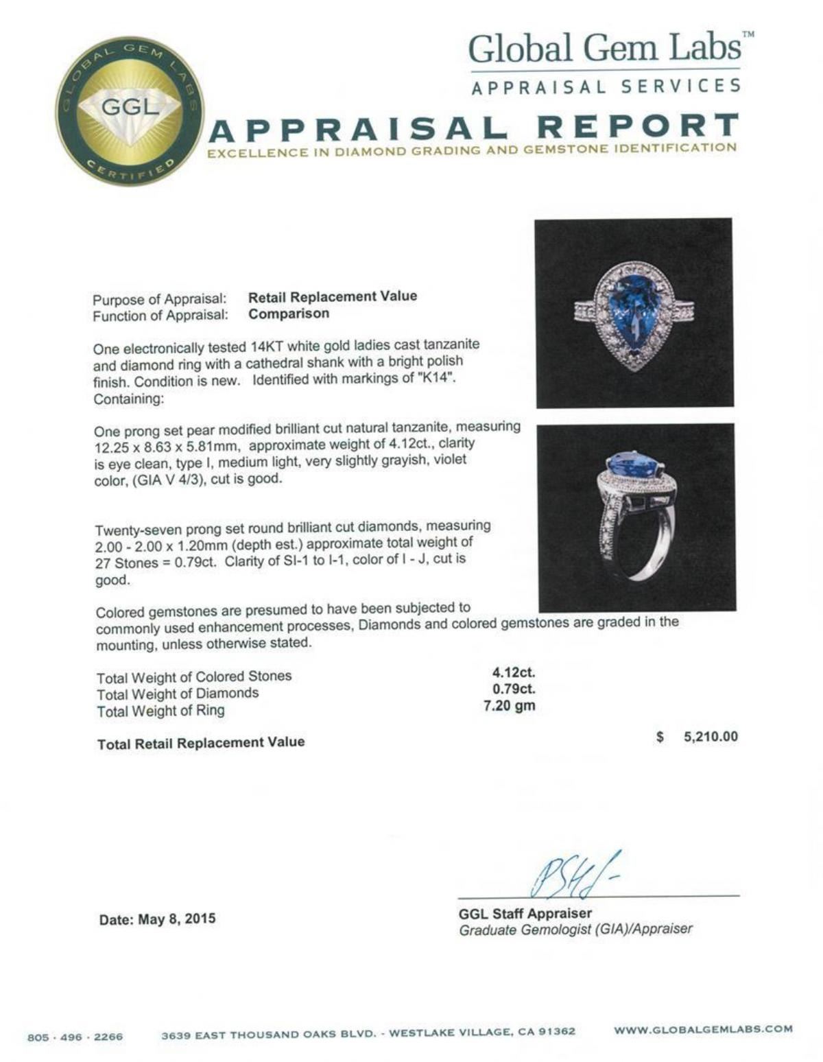 One electronically tested 14KT white gold ladies cast tanzanite and diamond ring with a cathedral shank with a bright polish finish. Identified with markings of "K14". Condition is new. Containing: One prong set pear modified brilliant cut natural tanzanite, measuring 12.25 x 8.63 x 5.81mm, approximate weight of 4.12ct., clarity is eye clean, type I, medium light, very slightly grayish, violet color, (GIA V 4/3), cut is good. Twenty-Seven prong set round brilliant cut diamonds, measuring 2.00 - 2.00 x 1.20mm (depth est.) approximate total weight of 27 Stones = 0.79ct. Clarity: SI-1 to I-1. Color: I - J, Cut is Good. Colored gemstones are presumed to have been subjected to commonly used enhancement processes, Diamonds and colored gemstones are graded in the mounting, unless otherwise stated. Total Weight of Colored Stones 4.12ct. Total Weight of Diamonds 0.79ct. Total Weight of Ring 7.20 grams.