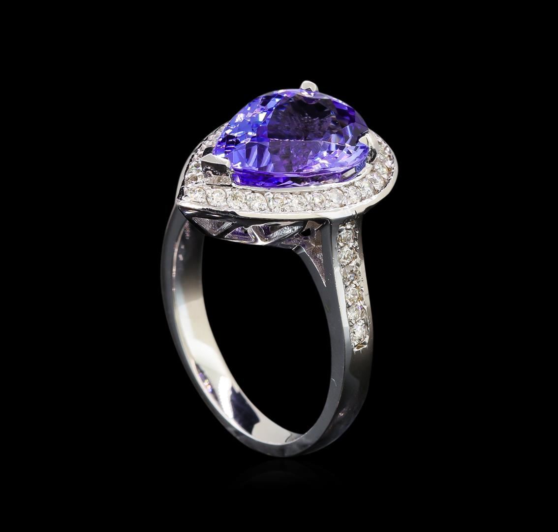 One electronically tested 14KT white gold ladies cast tanzanite and diamond ring with a bright polish finish. Identified with markings of "K14". Condition is new. Containing: One prong set pear modified brilliant cut natural tanzanite, measuring 12.25 x 9.12 x 5.52mm, approximate weight of 4.13ct., clarity is eye clean, type I, medium light, moderately strong, violet color, (GIA V 4/4), cut is good. Forty prong set round brilliant cut diamonds, measuring 1.30 - 1.30 x 0.78mm (depth est.) approximate. Total Weight of 40 Stones = 0.32ct. Clarity: SI-1 to SI-2. Color: I - J, Cut is Good. Colored gemstones are presumed to have been subjected to commonly used enhancement processes. All diamonds and colored gemstones are graded in the mounting, unless otherwise stated. Total Weight of Colored Stones 4.13ct. Total Weight of Diamonds 0.32ct. Total Weight of Ring 5.70 grams. GGL Appraised at $4,035.00.
