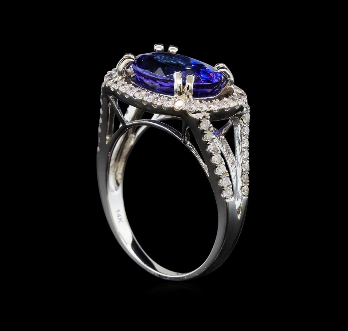 One electronically tested 14KT white gold ladies cast tanzanite and diamond ring with a split shank with a bright polish finish. Trademark is Orianne. Identified with markings of "K14". Condition is new. Containing: One prong set oval modified brilliant cut natural tanzanite, measuring 11.33 x 8.45 x 6.14mm, approximate weight of 4.14ct., clarity is eye clean, type I, medium light, very slightly grayish, violet color, (GIA V 4/3), cut is good. Sixty-One prong set round brilliant cut diamonds, measuring 1.20 - 1.20 x 0.72mm (depth est.) approximate total weight of 61 Stones = 0.38ct. Clarity: I-1 to I-2. Color: I - J. All diamonds and colored gemstones are graded in the mounting, unless otherwise stated. Colored gemstones are presumed to have been subjected to commonly used enhancement processes. Total Weight of Colored Stones 4.14ct. Total Weight of Diamonds 0.38ct. Total Weight of Ring 5.20 grams. GGL Appraised at $4,910.00.