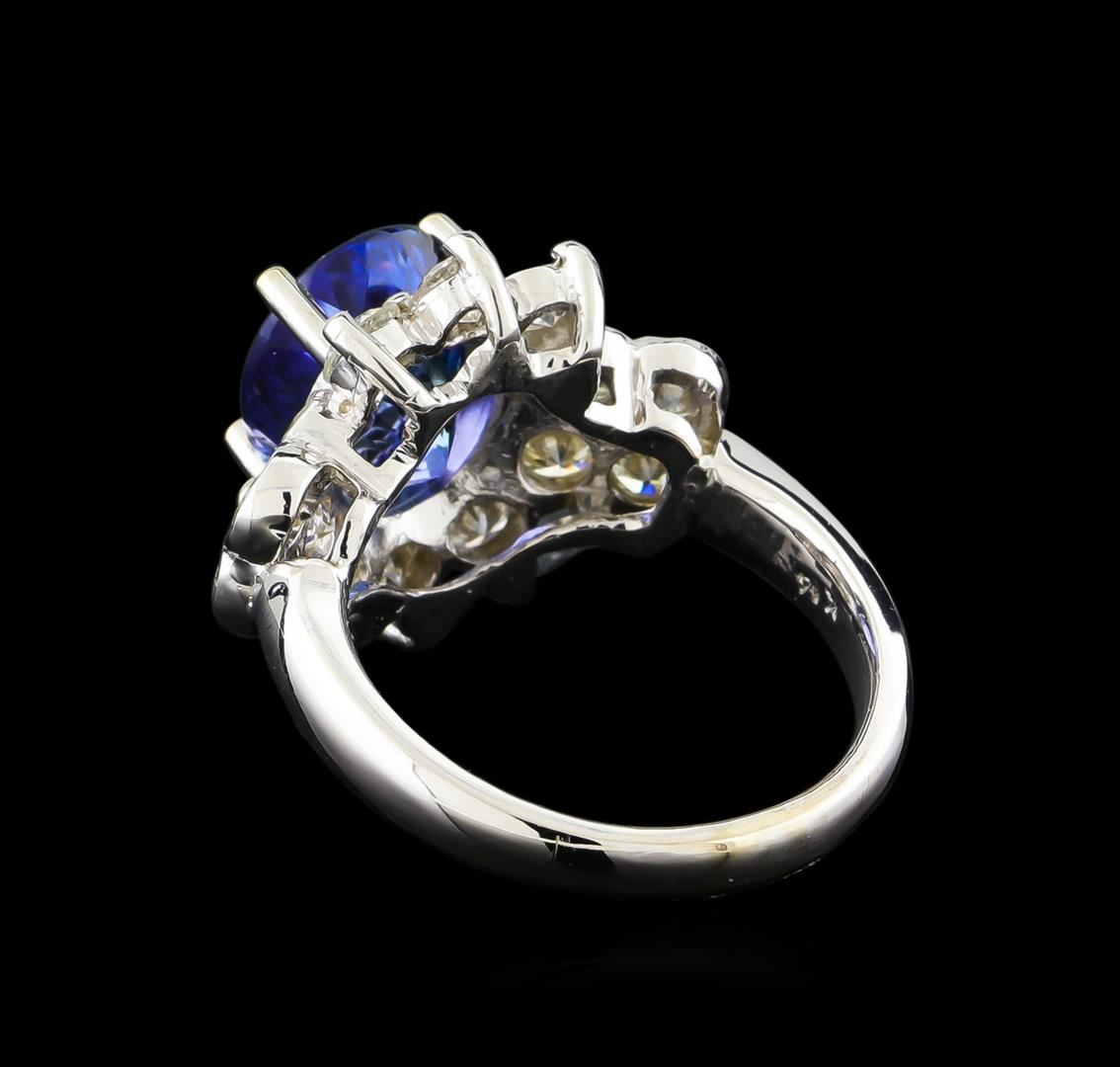 One electronically tested 14KT white gold ladies combination cast & assembled tanzanite and diamond ring with a flat shank with a bright polish finish. Identified with markings of "14K". Condition is new. Containing: One prong set oval modified brilliant cut natural tanzanite, measuring 10.35 x 8.45 x 7.00mm, approximate weight of 4.14ct., clarity is eye clean, type I, medium, very slightly grayish, violet color, (GIA V 5/3), cut is good. Fourteen prong set round brilliant cut diamonds, measuring 3.20 - 3.20 x 1.92mm (depth est.) approximate total weight of 14 Stones = 1.68ct. Clarity: SI-1 to I-1. Color: I - K, Cut is Good. Colored gemstones are presumed to have been subjected to commonly used enhancement processes. All diamonds and colored gemstones are graded in the mounting, unless otherwise stated. Total Weight of Colored Stones 4.14ct. Total Weight of Diamonds 1.68ct. Total Weight of Ring 7.20 grams. GGL Appraised at $12,065.00.