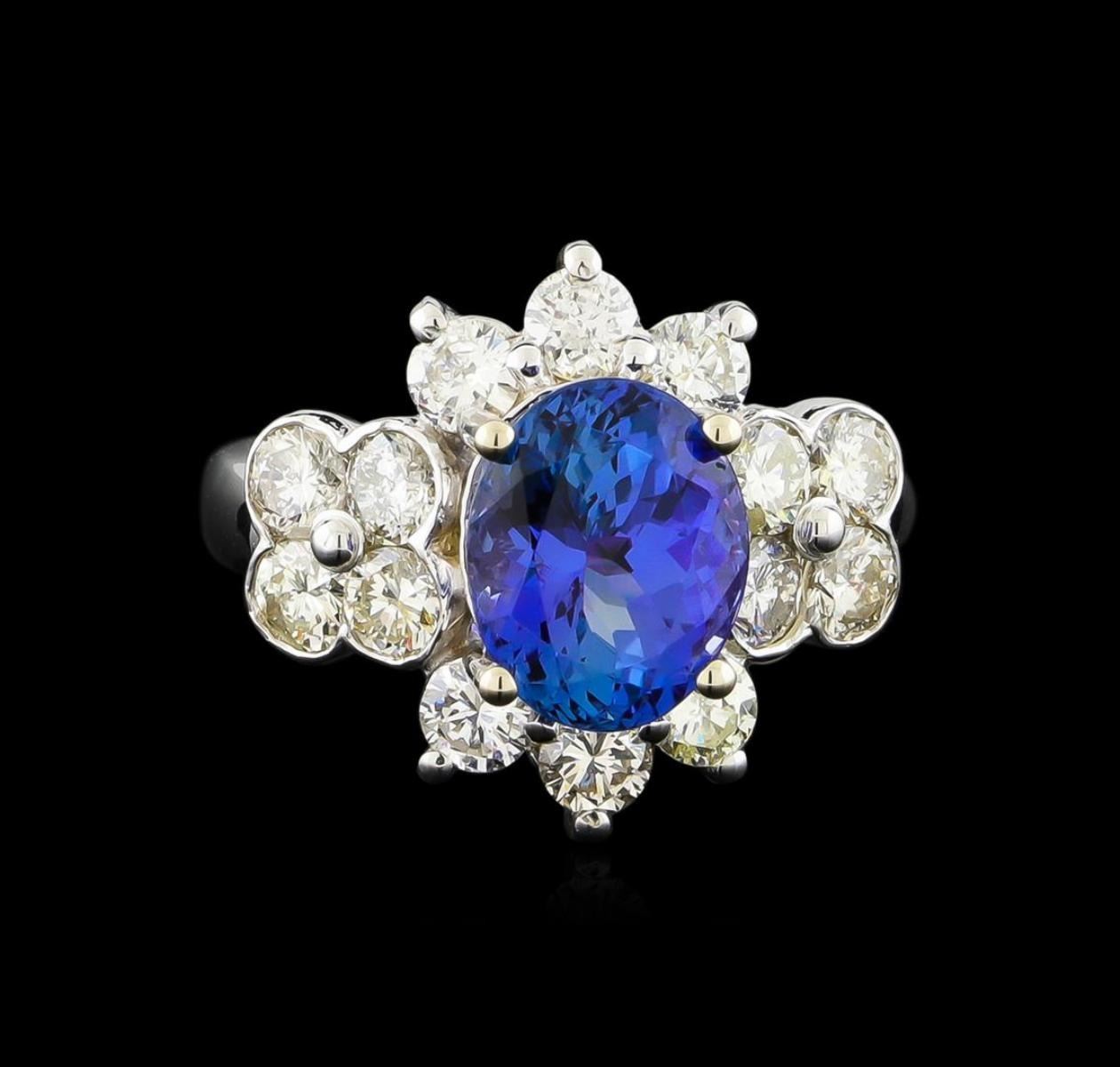 One electronically tested 14KT white gold ladies combination cast & assembled tanzanite and diamond ring with a flat shank with a bright polish finish. Identified with markings of "14K". Condition is new. Containing: One prong set oval modified brilliant cut natural tanzanite, measuring 10.35 x 8.45 x 7.00mm, approximate weight of 4.14ct., clarity is eye clean, type I, medium, very slightly grayish, violet color, (GIA V 5/3), cut is good. Fourteen prong set round brilliant cut diamonds, measuring 3.20 - 3.20 x 1.92mm (depth est.) approximate total weight of 14 Stones = 1.68ct. Clarity: SI-1 to I-1. Color: I - K, Cut is Good. Colored gemstones are presumed to have been subjected to commonly used enhancement processes. All diamonds and colored gemstones are graded in the mounting, unless otherwise stated. Total Weight of Colored Stones 4.14ct. Total Weight of Diamonds 1.68ct. Total Weight of Ring 7.20 grams. GGL Appraised.