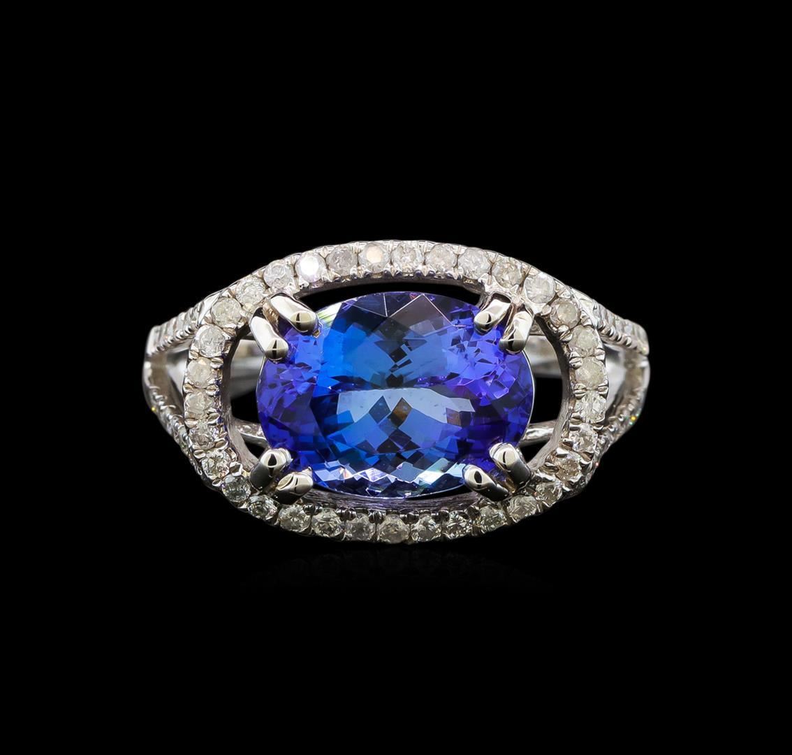 One electronically tested 14KT white gold ladies cast tanzanite and diamond ring with a split shank with a bright polish finish. Trademark is Orianne. Identified with markings of "K14". Condition is new. Containing: One prong set oval modified brilliant cut natural tanzanite, measuring 11.33 x 8.45 x 6.14mm, approximate weight of 4.14ct., clarity is eye clean, type I, medium light, very slightly grayish, violet color, (GIA V 4/3), cut is good. Sixty-One prong set round brilliant cut diamonds, measuring 1.20 - 1.20 x 0.72mm (depth est.) approximate total weight of 61 Stones = 0.38ct. Clarity: I-1 to I-2. Color: I - J. All diamonds and colored gemstones are graded in the mounting, unless otherwise stated. Colored gemstones are presumed to have been subjected to commonly used enhancement processes. Total Weight of Colored Stones 4.14ct. Total Weight of Diamonds 0.38ct. Total Weight of Ring 5.20 grams. GGL Appraised.