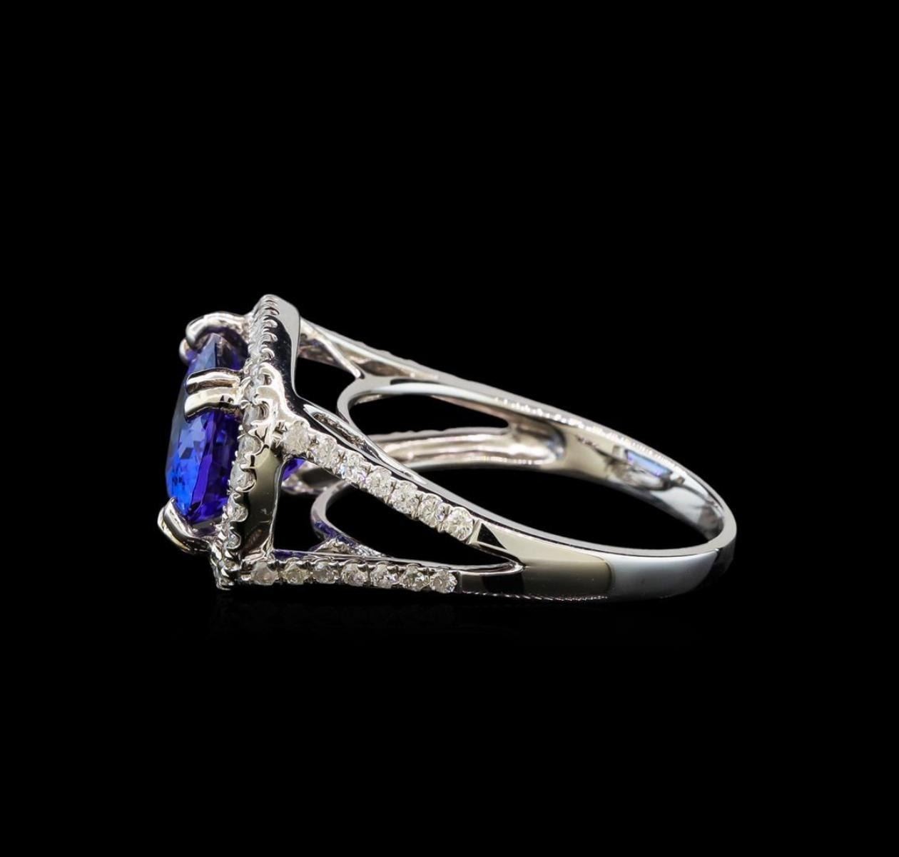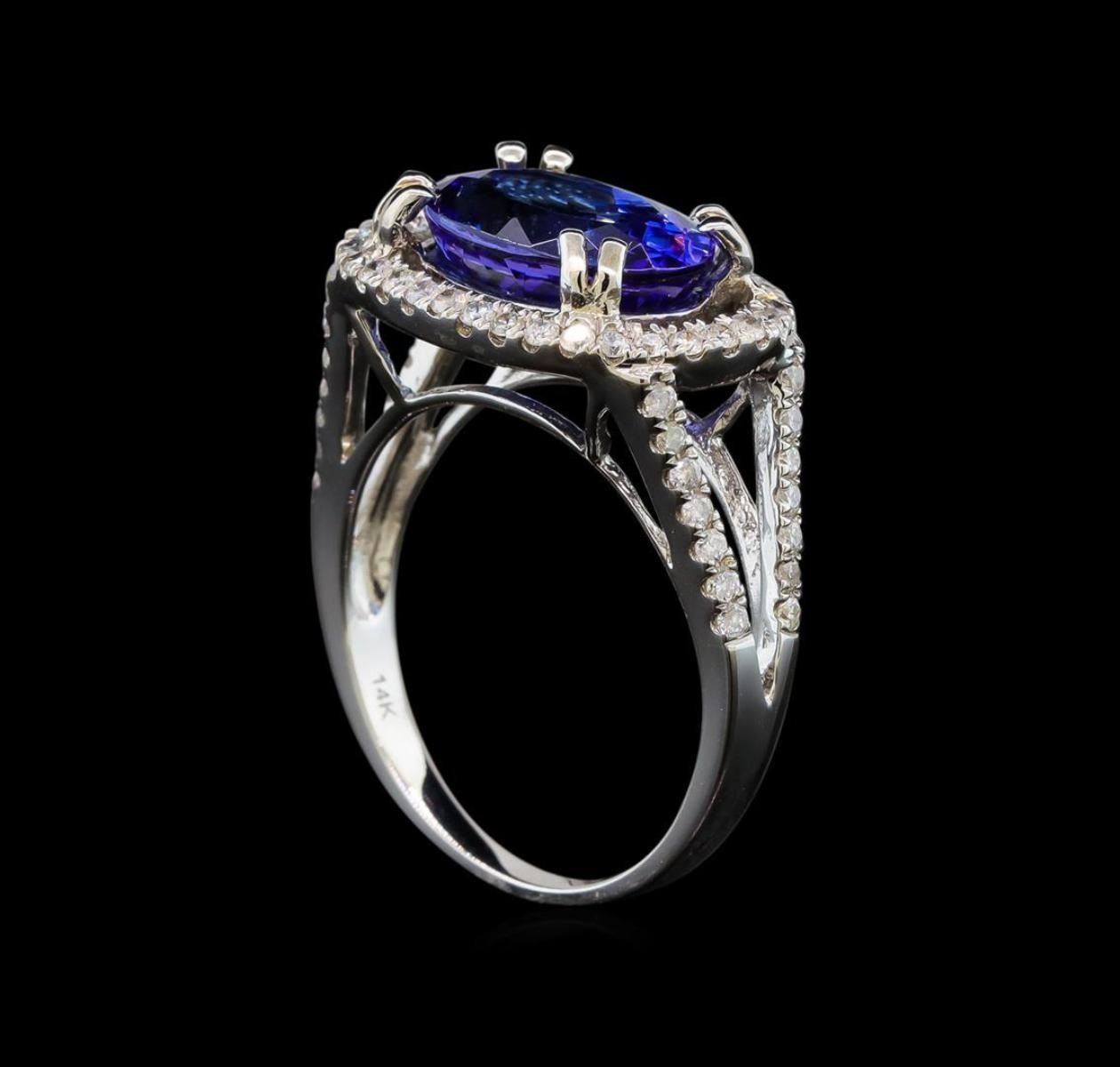 One electronically tested 14KT white gold ladies cast tanzanite and diamond ring with a split shank with a bright polish finish. Trademark is Orianne. Identified with markings of "K14". Condition is new. Containing: One prong set oval modified brilliant cut natural tanzanite, measuring 11.33 x 8.45 x 6.14mm, approximate weight of 4.14ct., clarity is eye clean, type I, medium light, very slightly grayish, violet color, (GIA V 4/3), cut is good. Sixty-One prong set round brilliant cut diamonds, measuring 1.20 - 1.20 x 0.72mm (depth est.) approximate total weight of 61 Stones = 0.38ct. Clarity: I-1 to I-2. Color: I - J. All diamonds and colored gemstones are graded in the mounting, unless otherwise stated. Colored gemstones are presumed to have been subjected to commonly used enhancement processes. Total Weight of Colored Stones 4.14ct. Total Weight of Diamonds 0.38ct. Total Weight of Ring 5.20 grams. GGL Appraised.