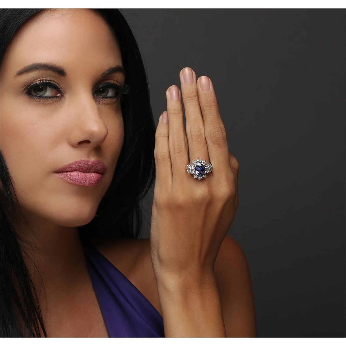 One electronically tested 14KT white gold ladies combination cast & assembled tanzanite and diamond ring with a flat shank with a bright polish finish. Identified with markings of "14K". Condition is new. Containing: One prong set oval modified brilliant cut natural tanzanite, measuring 10.35 x 8.45 x 7.00mm, approximate weight of 4.14ct., clarity is eye clean, type I, medium, very slightly grayish, violet color, (GIA V 5/3), cut is good. Fourteen prong set round brilliant cut diamonds, measuring 3.20 - 3.20 x 1.92mm (depth est.) approximate total weight of 14 Stones = 1.68ct. Clarity: SI-1 to I-1. Color: I - K, Cut is Good. Colored gemstones are presumed to have been subjected to commonly used enhancement processes. All diamonds and colored gemstones are graded in the mounting, unless otherwise stated. Total Weight of Colored Stones 4.14ct. Total Weight of Diamonds 1.68ct. Total Weight of Ring 7.20 grams. GGL Appraised at $12,065.00.