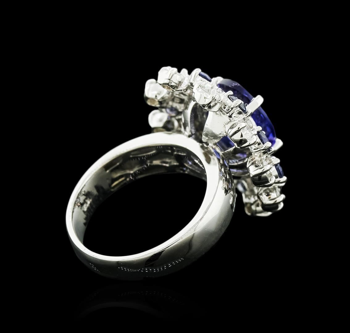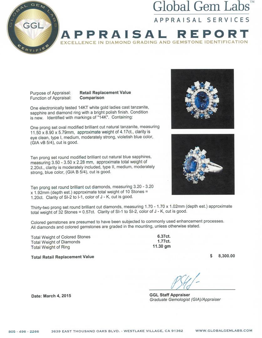 One electronically tested 14KT white gold ladies cast tanzanite, sapphire and diamond ring with a bright polish finish. Identified with markings of "14K". Condition is new. Containing: One prong set oval modified brilliant cut natural tanzanite, measuring 11.50 x 8.90 x 5.79mm, approximate weight of 4.17ct., clarity is eye clean, type I, medium, moderately strong, violetish blue color, (GIA vB 5/4), cut is good. Ten prong set round modified brilliant cut natural blue sapphires, measuring 3.50 - 3.50 x 2.28 mm, approximate total weight of 2.20ct., clarity is moderately included, type II, medium, moderately strong, blue color, (GIA B 5/4), cut is good. Ten prong set round brilliant cut diamonds, measuring 3.20 - 3.20 x 1.92mm (depth est.) approximate total weight of 10 Stones = 1.20ct. Clarity: SI-2 to I-1. Color: J - K, Cut is Good. Thirty-Two prong set round brilliant cut diamonds, measuring 1.70 - 1.70 x 1.02mm (depth est.) approximate total weight of 32 Stones = 0.57ct. Clarity: SI-1 to SI-2. Color: J - K, Cut is Good. Colored gemstones are presumed to have been subjected to commonly used enhancement processes. All diamonds and colored gemstones are graded in the mounting, unless otherwise stated. Total Weight of Colored Stones 6.37ct. Total Weight of Diamonds 1.77ct. Total Weight of Ring 11.30 grams. GGL Appraised at $8,300.00.