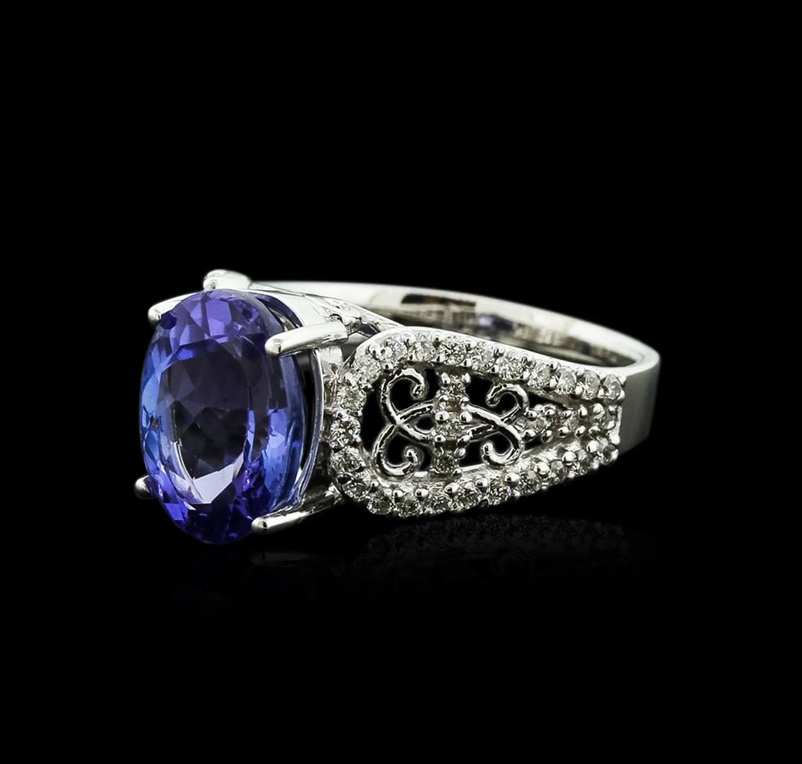 One electronically tested 14KT white gold ladies cast tanzanite and diamond ring with a bright polish finish. Identified with markings of "14K". Condition is new. Containing: One prong set oval modified brilliant cut natural tanzanite, measuring 11.50 x 8.90 x 5.79mm, approximate weight of 4.17ct., clarity is eye clean, type I, medium light, very slightly grayish, violet color, (GIA V 4/3), cut is good. Fifty-Eight prong set round brilliant cut diamonds, measuring 1.20 - 1.20 x 0.72mm (depth est.) approximate total weight of 58 Stones = 0.37ct. . Clarity: I-1 to I-2. Color: I - J, Cut is Good. Colored gemstones are presumed to have been subjected to commonly used enhancement processes. All diamonds and colored gemstones are graded in the mounting, unless otherwise stated.. Total Weight of Colored Stones 4.17ct.. Total Weight of Diamonds 0.37ct.. Total Weight of Ring 5.90 grams. GGL Appraised at $4,050.00.