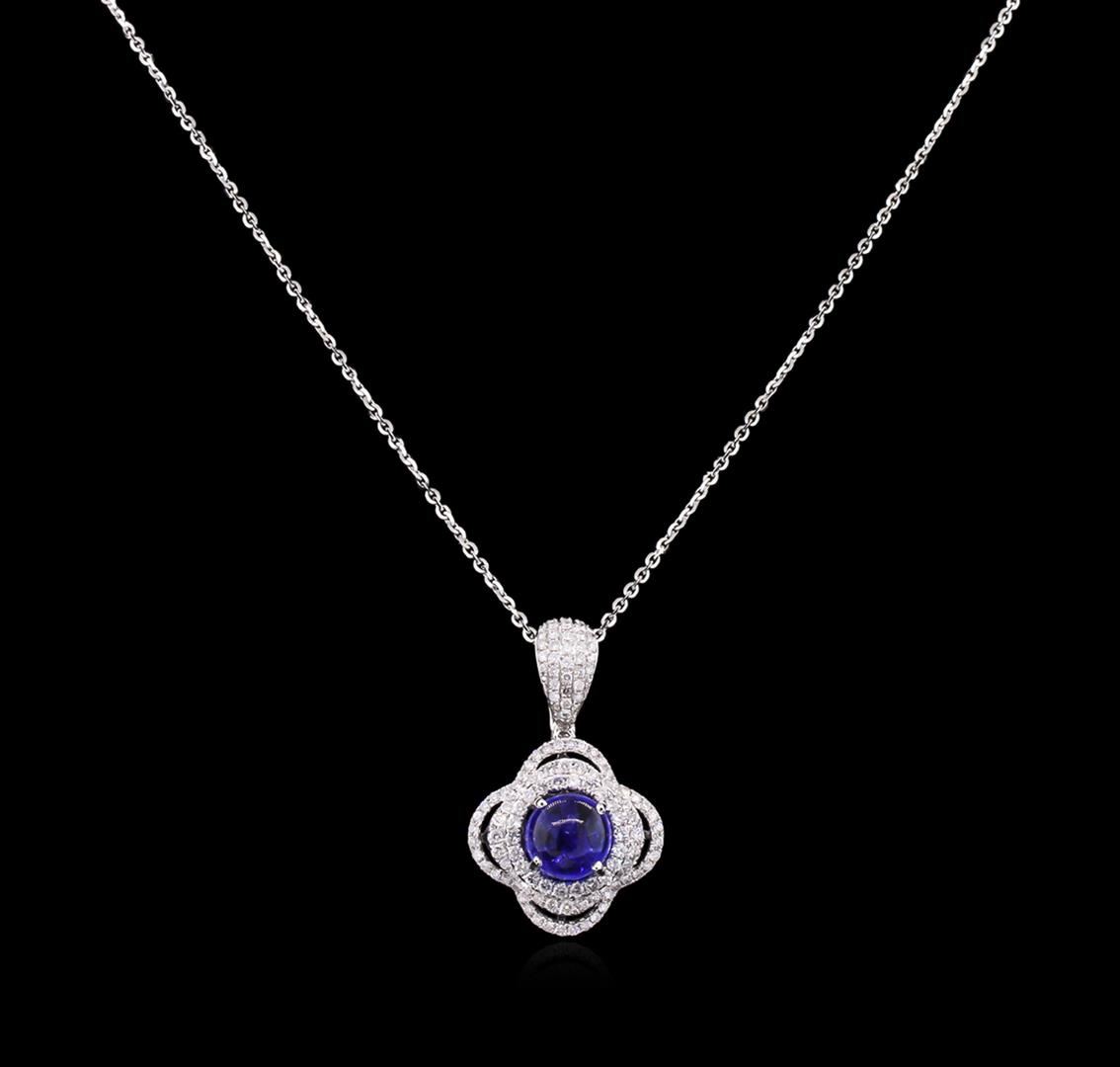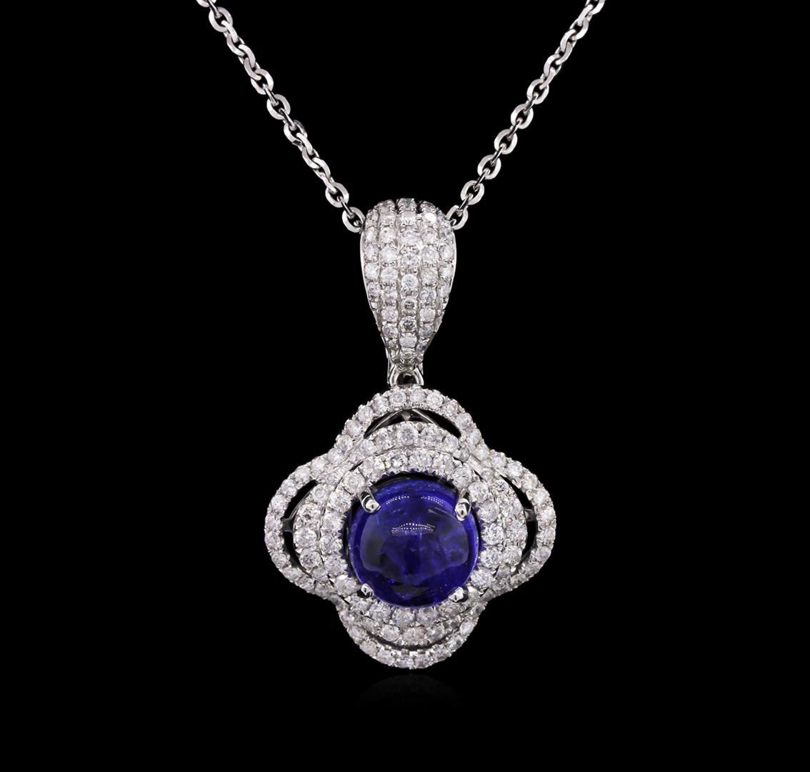 One electronically tested 14KT white gold Ladies combination cast & assembled pendant & chain 17.0" long, medium cable link with a lobster claw clasp with a bright polish finish. Condition is new. Identified with markings of "14K". Containing: One prong set round cabochon cut natural tanzanite, measuring 8.24 x 8.24 x 6.80mm, approximate weight of 4.18ct., clarity is moderately included, type I, medium light, very slightly grayish, violet color, (GIA V 4/3), cut is good. Colored gemstones are presumed to have been subjected to commonly used color/clarity enhancement processes. One Hundred Thirty-Six prong set round brilliant cut diamonds, measuring 1.50 - 1.30 x 0.84mm (depth est.) approximate. Total Weight of 136 Stones = 1.36ct. Clarity: I-1 to I-2. Color: H - I, Cut is Good. Total Weight of Colored Stones 4.18ct. Total Weight of Diamonds 1.36ct. Total Weight of Pendant & Chain 12.60 grams. GGL Appraised at $12,135.00.