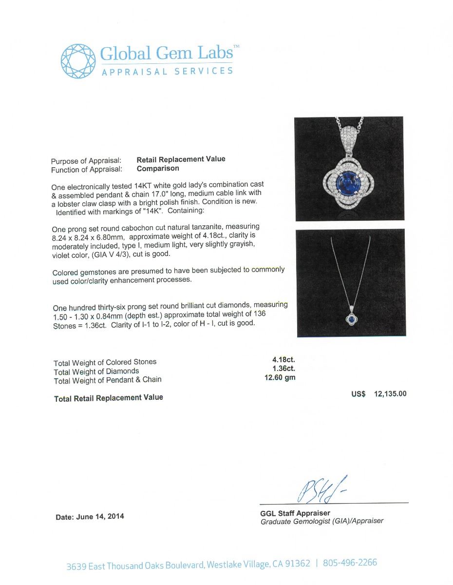 One electronically tested 14KT white gold Ladies combination cast & assembled pendant & chain 17.0" long, medium cable link with a lobster claw clasp with a bright polish finish. Condition is new. Identified with markings of "14K". Containing: One prong set round cabochon cut natural tanzanite, measuring 8.24 x 8.24 x 6.80mm, approximate weight of 4.18ct., clarity is moderately included, type I, medium light, very slightly grayish, violet color, (GIA V 4/3), cut is good. Colored gemstones are presumed to have been subjected to commonly used color/clarity enhancement processes. One Hundred Thirty-Six prong set round brilliant cut diamonds, measuring 1.50 - 1.30 x 0.84mm (depth est.) approximate. Total Weight of 136 Stones = 1.36ct. Clarity: I-1 to I-2. Color: H - I, Cut is Good. Total Weight of Colored Stones 4.18ct. Total Weight of Diamonds 1.36ct. Total Weight of Pendant & Chain 12.60 grams. GGL Appraised at $12,135.00.