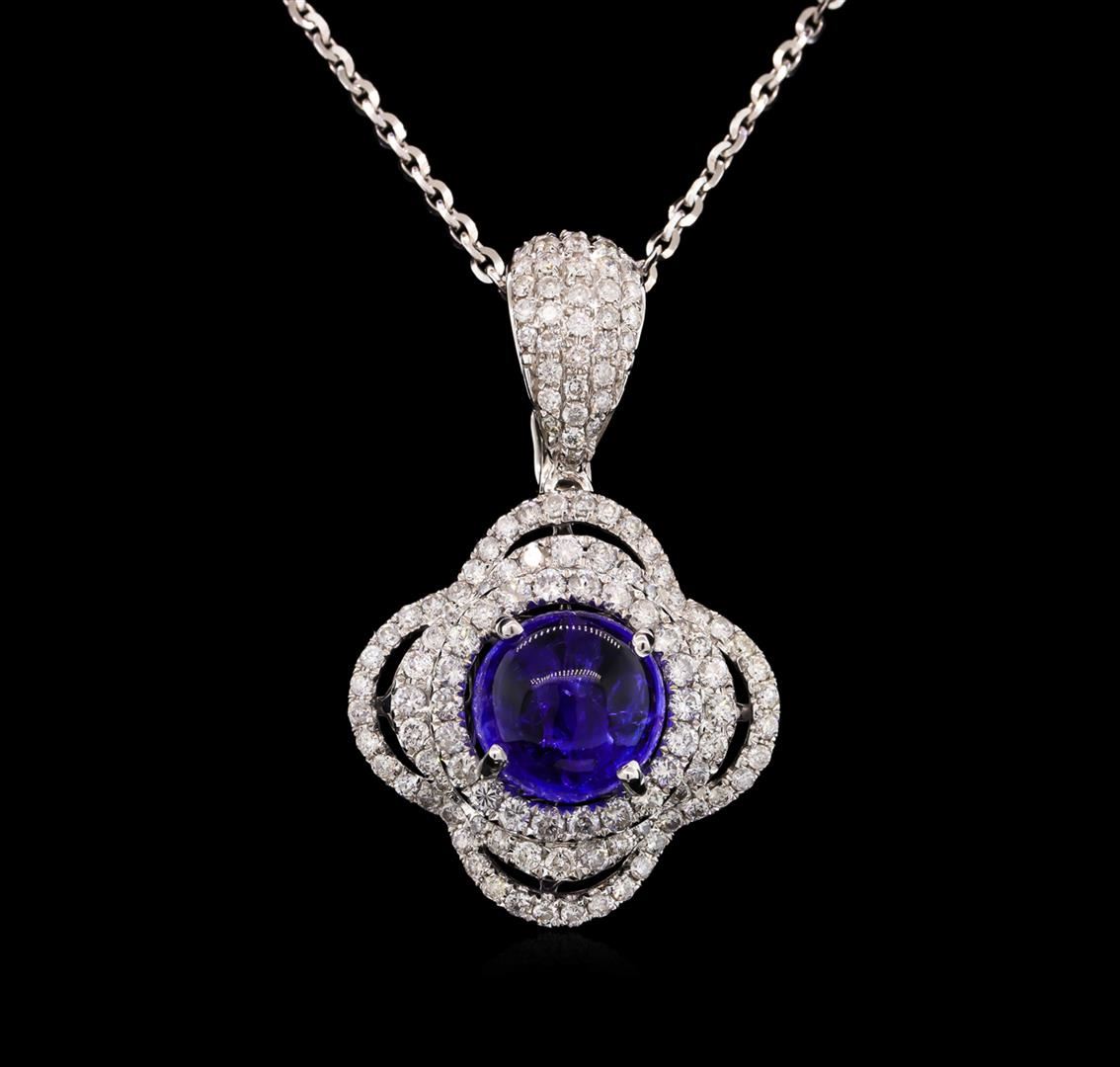 One electronically tested 14KT white gold Ladies combination cast & assembled pendant & chain 17.0" long, medium cable link with a lobster claw clasp with a bright polish finish. Condition is new. Identified with markings of "14K". Containing: One prong set round cabochon cut natural tanzanite, measuring 8.24 x 8.24 x 6.80mm, approximate weight of 4.18ct., clarity is moderately included, type I, medium light, very slightly grayish, violet color, (GIA V 4/3), cut is good. Colored gemstones are presumed to have been subjected to commonly used color/clarity enhancement processes. One Hundred Thirty-Six prong set round brilliant cut diamonds, measuring 1.50 - 1.30 x 0.84mm (depth est.) approximate. Total Weight of 136 Stones = 1.36ct. Clarity: I-1 to I-2. Color: H - I, Cut is Good. Total Weight of Colored Stones 4.18ct. Total Weight of Diamonds 1.36ct. Total Weight of Pendant & Chain 12.60 grams. GGL Appraised at $12,135.00.