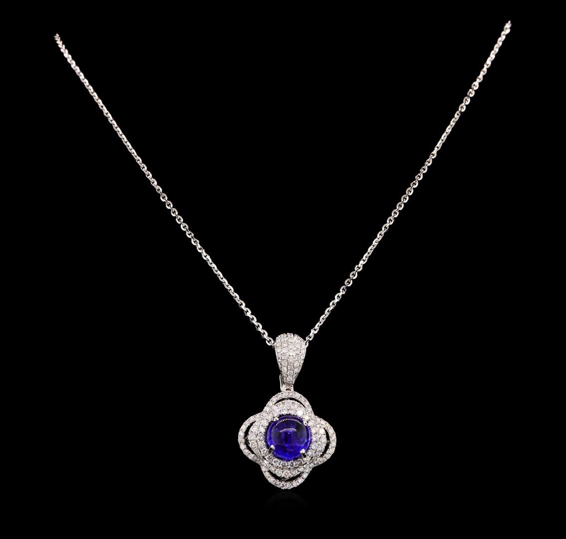 One electronically tested 14KT white gold Ladies combination cast & assembled pendant & chain 17.0" long, medium cable link with a lobster claw clasp with a bright polish finish. Condition is new. Identified with markings of "14K". Containing: One prong set round cabochon cut natural tanzanite, measuring 8.24 x 8.24 x 6.80mm, approximate weight of 4.18ct., clarity is moderately included, type I, medium light, very slightly grayish, violet color, (GIA V 4/3), cut is good. Colored gemstones are presumed to have been subjected to commonly used color/clarity enhancement processes. One Hundred Thirty-Six prong set round brilliant cut diamonds, measuring 1.50 - 1.30 x 0.84mm (depth est.) approximate. Total Weight of 136 Stones = 1.36ct. Clarity: I-1 to I-2. Color: H - I, Cut is Good. Total Weight of Colored Stones 4.18ct. Total Weight of Diamonds 1.36ct. Total Weight of Pendant & Chain 12.60 grams. GGL Appraised at $12,135.00.
