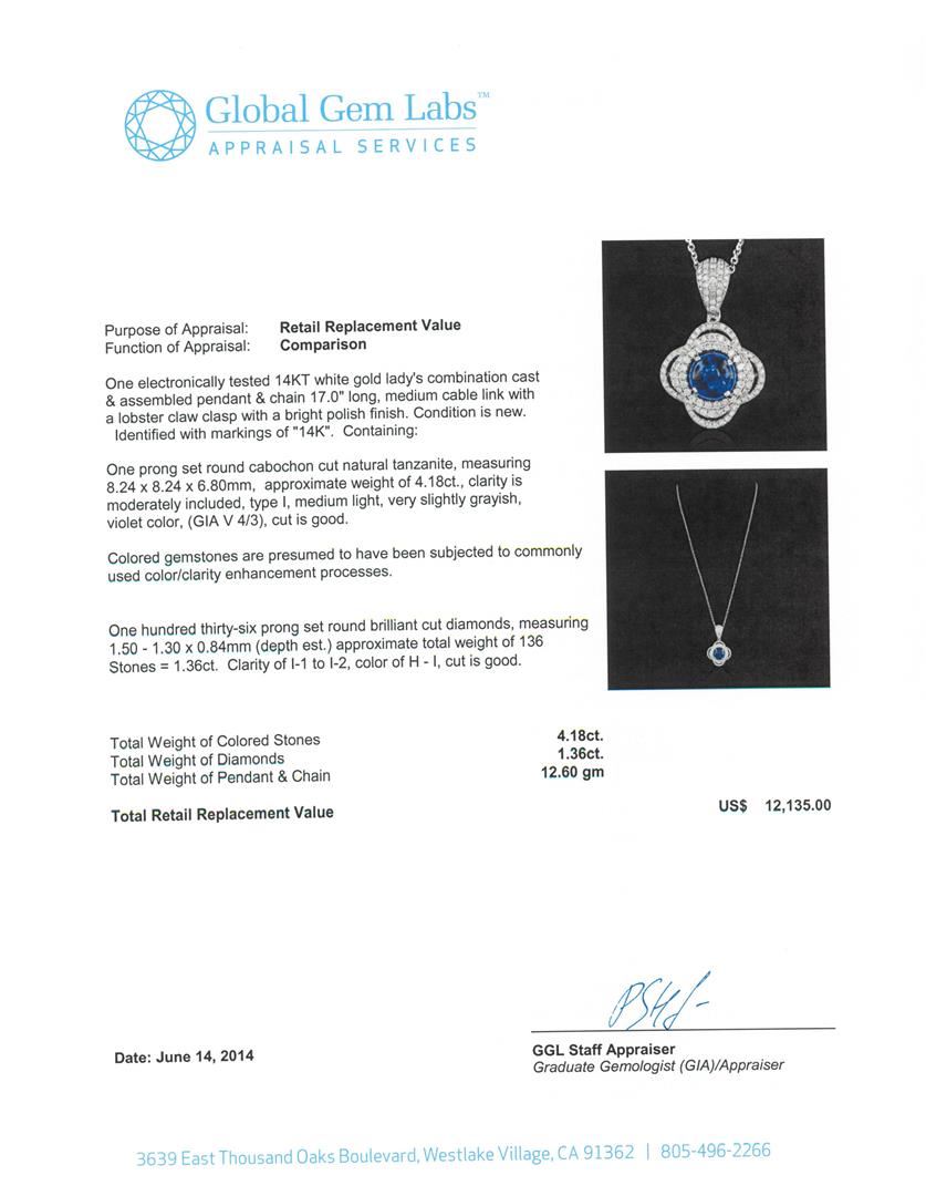 One electronically tested 14KT white gold Ladies combination cast & assembled pendant & chain 17.0" long, medium cable link with a lobster claw clasp with a bright polish finish. Condition is new. Identified with markings of "14K". Containing: One prong set round cabochon cut natural tanzanite, measuring 8.24 x 8.24 x 6.80mm, approximate weight of 4.18ct., clarity is moderately included, type I, medium light, very slightly grayish, violet color, (GIA V 4/3), cut is good. Colored gemstones are presumed to have been subjected to commonly used color/clarity enhancement processes. One Hundred Thirty-Six prong set round brilliant cut diamonds, measuring 1.50 - 1.30 x 0.84mm (depth est.) approximate. Total Weight of 136 Stones = 1.36ct. Clarity: I-1 to I-2. Color: H - I, Cut is Good. Total Weight of Colored Stones 4.18ct. Total Weight of Diamonds 1.36ct. Total Weight of Pendant & Chain 12.60 grams. GGL Appraised.