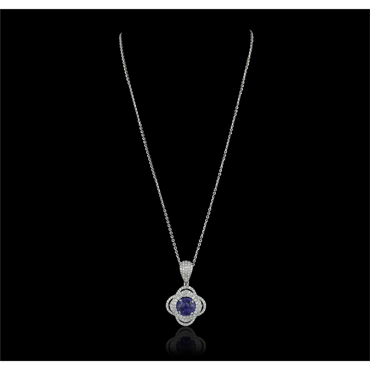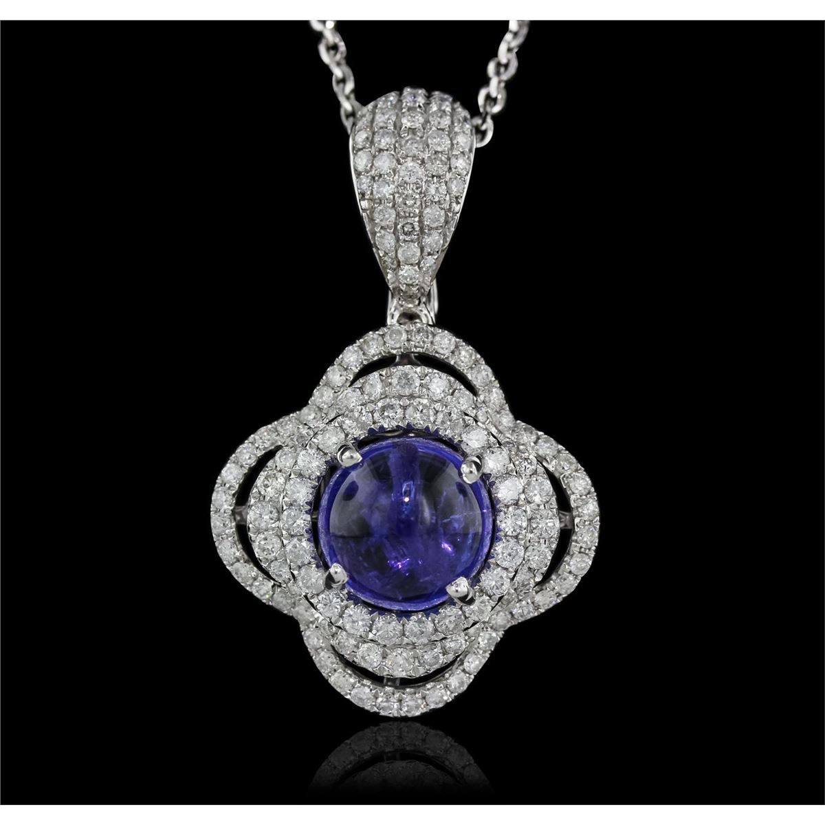 One electronically tested 14KT white gold Ladies combination cast & assembled pendant & chain 17.0" long, medium cable link with a lobster claw clasp with a bright polish finish. Condition is new. Identified with markings of "14K". Containing: One prong set round cabochon cut natural tanzanite, measuring 8.24 x 8.24 x 6.80mm, approximate weight of 4.18ct., clarity is moderately included, type I, medium light, very slightly grayish, violet color, (GIA V 4/3), cut is good. Colored gemstones are presumed to have been subjected to commonly used color/clarity enhancement processes. One Hundred Thirty-Six prong set round brilliant cut diamonds, measuring 1.50 - 1.30 x 0.84mm (depth est.) approximate. Total Weight of 136 Stones = 1.36ct. Clarity: I-1 to I-2. Color: H - I, Cut is Good. Total Weight of Colored Stones 4.18ct. Total Weight of Diamonds 1.36ct. Total Weight of Pendant & Chain 12.60 grams. GGL Appraised at $12,135.00.