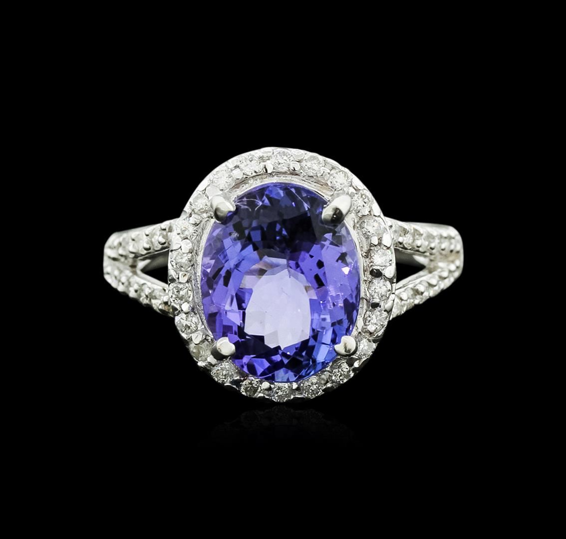 One electronically tested 14KT white gold ladies cast tanzanite and diamond ring with a bright and brushed finish. Identified with markings of "14K". Condition is new. Containing: One prong set oval modified brilliant cut natural tanzanite, measuring 11.30 x 9.00. x 5.85mm, approximate weight of 4.19ct., clarity is eye clean, type I, medium light, very slightly grayish, violet color, (GIA V 4/3), cut is good. Forty-Nine prong set round brilliant cut diamonds, measuring 1.40 - 1.40 x 0.84mm (depth est.) approximate total weight of 49 Stones = 0.49ct. Clarity: SI-1 to I-1. Color: I - J. Colored gemstones are presumed to have been subjected to commonly used enhancement processes. All diamonds and colored gemstones are graded in the mounting, unless otherwise stated. Total Weight of Colored Stones 4.19ct. Total Weight of Diamonds 0.49ct. Total Weight of Ring 5.50 grams. GGL Appraised at $4,920.00.