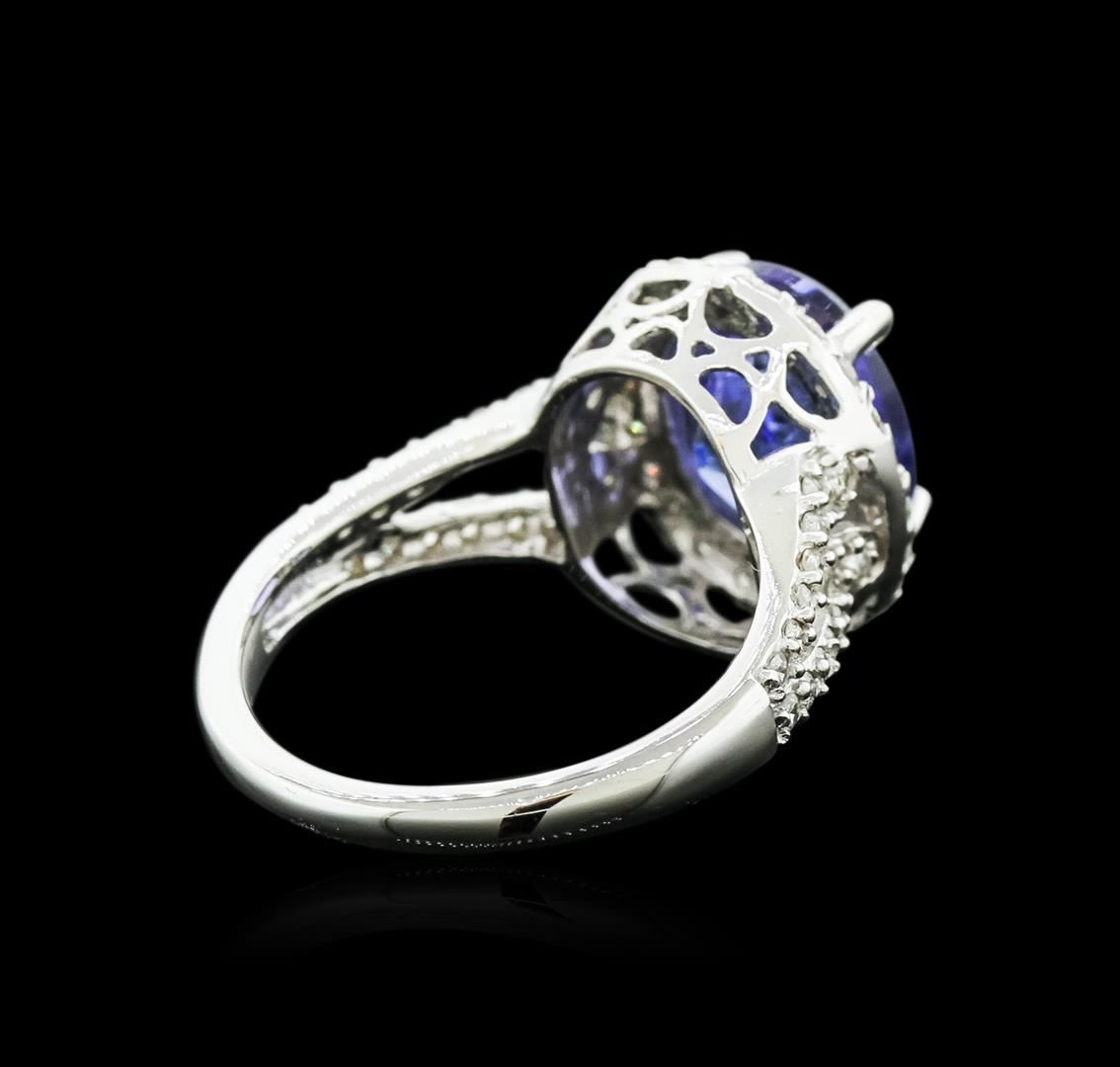 One electronically tested 14KT white gold ladies cast tanzanite and diamond ring with a bright and brushed finish. Identified with markings of "14K". Condition is new. Containing: One prong set oval modified brilliant cut natural tanzanite, measuring 11.30 x 9.00. x 5.85mm, approximate weight of 4.19ct., clarity is eye clean, type I, medium light, very slightly grayish, violet color, (GIA V 4/3), cut is good. Forty-Nine prong set round brilliant cut diamonds, measuring 1.40 - 1.40 x 0.84mm (depth est.) approximate total weight of 49 Stones = 0.49ct. Clarity: SI-1 to I-1. Color: I - J. Colored gemstones are presumed to have been subjected to commonly used enhancement processes. All diamonds and colored gemstones are graded in the mounting, unless otherwise stated. Total Weight of Colored Stones 4.19ct. Total Weight of Diamonds 0.49ct. Total Weight of Ring 5.50 grams. GGL Appraised at $4,920.00.