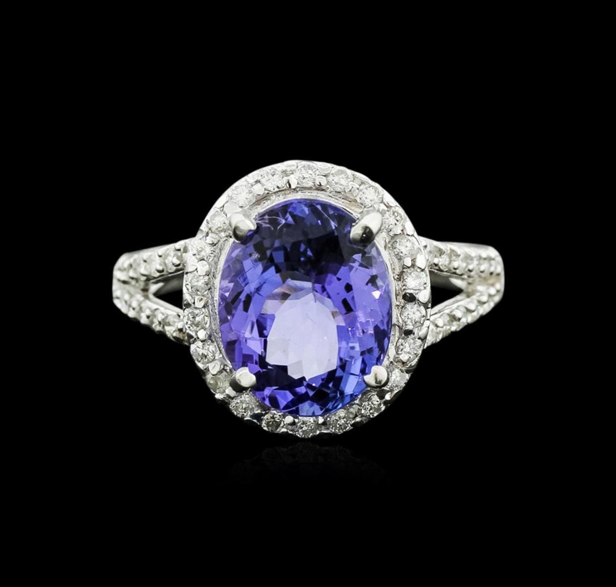 One electronically tested 14KT white gold ladies cast tanzanite and diamond ring with a bright and brushed finish. Identified with markings of "14K". Condition is new. Containing: One prong set oval modified brilliant cut natural tanzanite, measuring 11.30 x 9.00. x 5.85mm, approximate weight of 4.19ct., clarity is eye clean, type I, medium light, very slightly grayish, violet color, (GIA V 4/3), cut is good. Forty-Nine prong set round brilliant cut diamonds, measuring 1.40 - 1.40 x 0.84mm (depth est.) approximate total weight of 49 Stones = 0.49ct. Clarity: SI-1 to I-1. Color: I - J. Colored gemstones are presumed to have been subjected to commonly used enhancement processes. All diamonds and colored gemstones are graded in the mounting, unless otherwise stated. Total Weight of Colored Stones 4.19ct. Total Weight of Diamonds 0.49ct. Total Weight of Ring 5.50 grams. GGL Appraised.