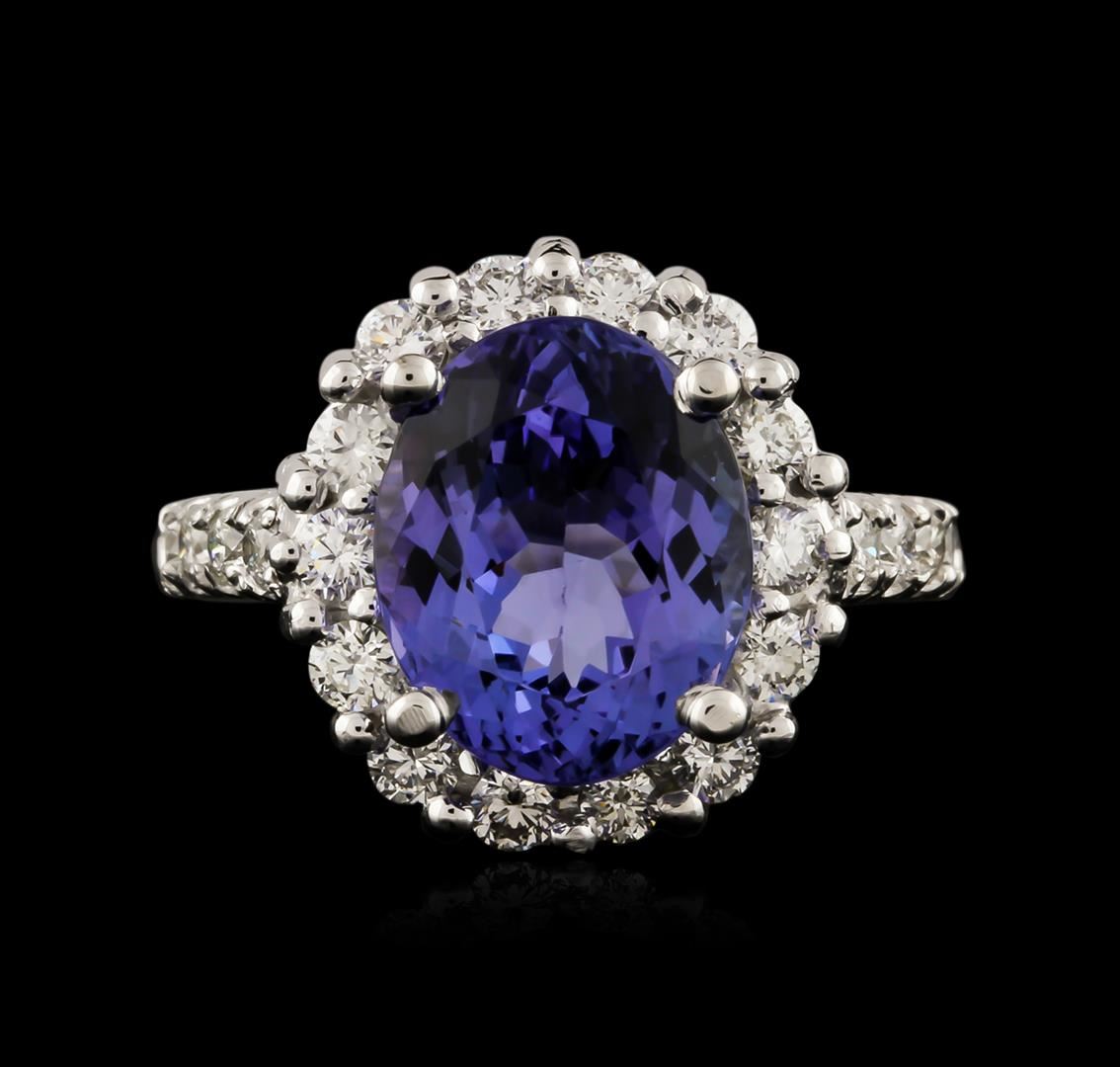 One electronically tested 14KT white gold ladies cast tanzanite and diamond ring with a bright polish finish. Identified with markings of "K14". Condition is new. Containing: One prong set oval modified brilliant cut natural tanzanite, measuring 11.70 x 9.50 x 5.40mm, approximate weight of 4.22ct., clarity is eye clean, type I, medium light, very slightly grayish, violet color, (GIA V 4/3), cut is good. Twenty-Two prong set round brilliant cut diamonds, measuring 2.00 - 2.00 x 1.20mm (depth est.) approximate total weight of 22 Stones = 0.64ct. Clarity: SI-1 to SI-2. Color: G - H, Cut is Good. Colored gemstones are presumed to have been subjected to commonly used enhancement processes. All diamonds and colored gemstones are graded in the mounting, unless otherwise stated. Total Weight of Colored Stones 4.22ct. Total Weight of Diamonds 0.64ct. Total Weight of Ring 7.30 grams. GGL Appraised at $5,780.00.