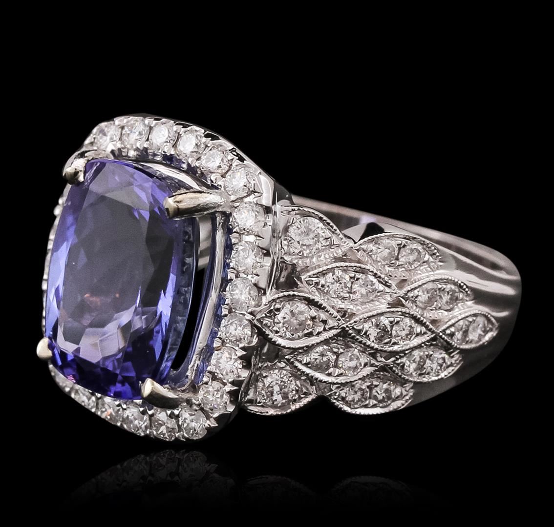 One electronically tested 14KT white gold ladies combination cast & assembled tanzanite and diamond ring with a flat shank with a bright polish finish. Identified with markings of "14K". Condition is new. Containing: One prong set rectangular cushion modified brilliant cut natural tanzanite, measuring 11.07 x 8.32 x 5.84mm, approximate weight of 4.23ct., clarity is eye clean, type I, medium, moderately strong, violet color, (GIA V 5/4), cut is good. Sixty-One prong set round brilliant cut diamonds, measuring 1.50 - 1.50 x 0.90mm (depth est.) approximate total weight of 61 Stones = 0.75ct. Clarity: SI-1 to I-1. Color: I - J, Cut is Good. Colored gemstones are presumed to have been subjected to commonly used enhancement processes. All diamonds and colored gemstones are graded in the mounting, unless otherwise stated. Total Weight of Colored Stones 4.23ct. Total Weight of Diamonds 0.75ct. Total Weight of Ring 7.80 grams. GGL Appraised at $10,200.00.