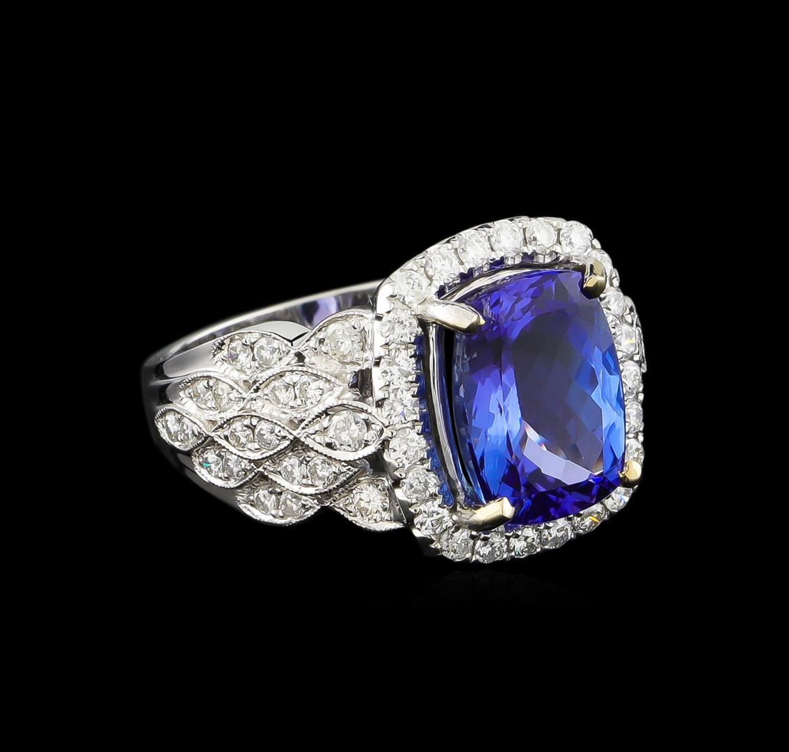 One electronically tested 14KT white gold ladies combination cast & assembled tanzanite and diamond ring with a flat shank with a bright polish finish. Identified with markings of "14K". Condition is new. Containing: One prong set rectangular cushion modified brilliant cut natural tanzanite, measuring 11.07 x 8.32 x 5.84mm, approximate weight of 4.23ct., clarity is eye clean, type I, medium, moderately strong, violet color, (GIA V 5/4), cut is good. Sixty-One prong set round brilliant cut diamonds, measuring 1.50 - 1.50 x 0.90mm (depth est.) approximate total weight of 61 Stones = 0.75ct. Clarity: SI-1 to I-1. Color: I - J, Cut is Good. Colored gemstones are presumed to have been subjected to commonly used enhancement processes. All diamonds and colored gemstones are graded in the mounting, unless otherwise stated. Total Weight of Colored Stones 4.23ct. Total Weight of Diamonds 0.75ct. Total Weight of Ring 7.80 grams. GGL Appraised at $10,200.00.