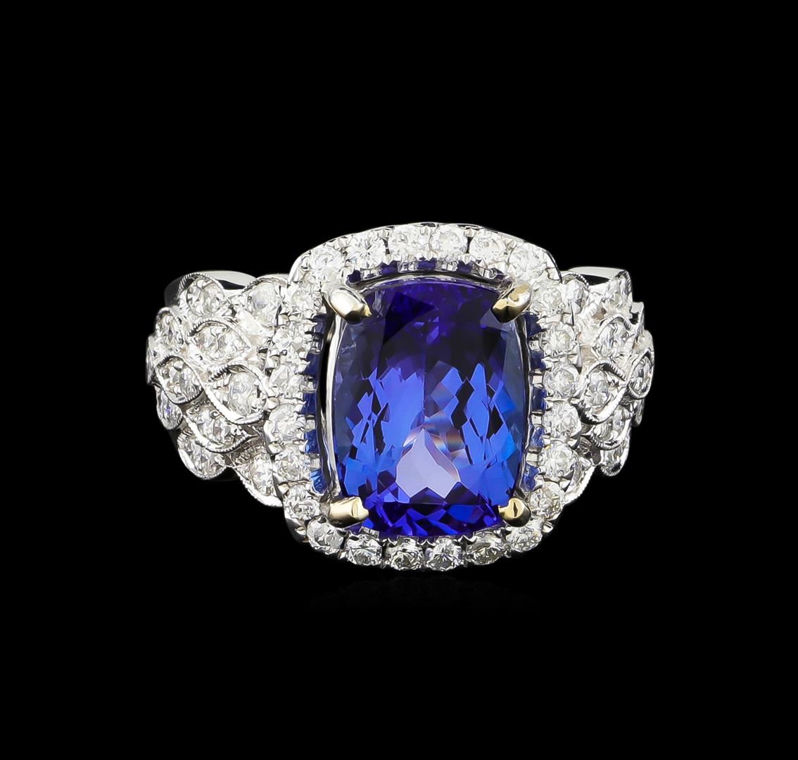 One electronically tested 14KT white gold ladies combination cast & assembled tanzanite and diamond ring with a flat shank with a bright polish finish. Identified with markings of "14K". Condition is new. Containing: One prong set rectangular cushion modified brilliant cut natural tanzanite, measuring 11.07 x 8.32 x 5.84mm, approximate weight of 4.23ct., clarity is eye clean, type I, medium, moderately strong, violet color, (GIA V 5/4), cut is good. Sixty-One prong set round brilliant cut diamonds, measuring 1.50 - 1.50 x 0.90mm (depth est.) approximate total weight of 61 Stones = 0.75ct. Clarity: SI-1 to I-1. Color: I - J, Cut is Good. Colored gemstones are presumed to have been subjected to commonly used enhancement processes. All diamonds and colored gemstones are graded in the mounting, unless otherwise stated. Total Weight of Colored Stones 4.23ct. Total Weight of Diamonds 0.75ct. Total Weight of Ring 7.80 grams. GGL Appraised at $10,200.00.