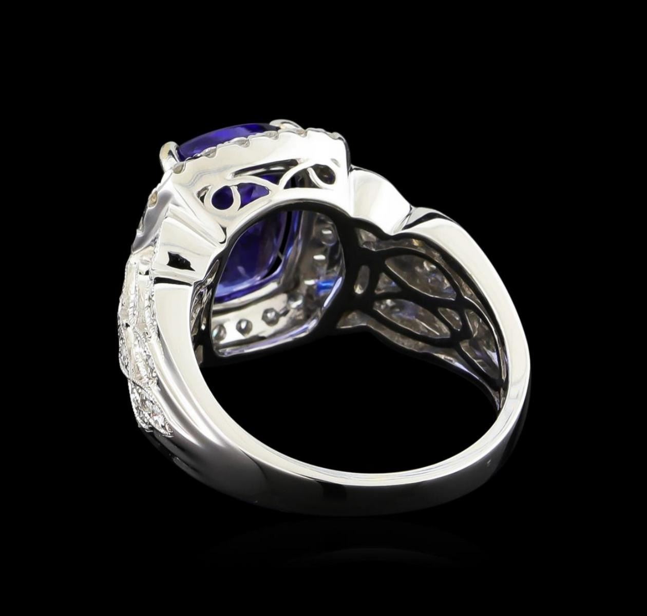 One electronically tested 14KT white gold ladies combination cast & assembled tanzanite and diamond ring with a flat shank with a bright polish finish. Identified with markings of "14K". Condition is new. Containing: One prong set rectangular cushion modified brilliant cut natural tanzanite, measuring 11.07 x 8.32 x 5.84mm, approximate weight of 4.23ct., clarity is eye clean, type I, medium, moderately strong, violet color, (GIA V 5/4), cut is good. Sixty-One prong set round brilliant cut diamonds, measuring 1.50 - 1.50 x 0.90mm (depth est.) approximate total weight of 61 Stones = 0.75ct. Clarity: SI-1 to I-1. Color: I - J, Cut is Good. Colored gemstones are presumed to have been subjected to commonly used enhancement processes. All diamonds and colored gemstones are graded in the mounting, unless otherwise stated. Total Weight of Colored Stones 4.23ct. Total Weight of Diamonds 0.75ct. Total Weight of Ring 7.80 grams. GGL Appraised.