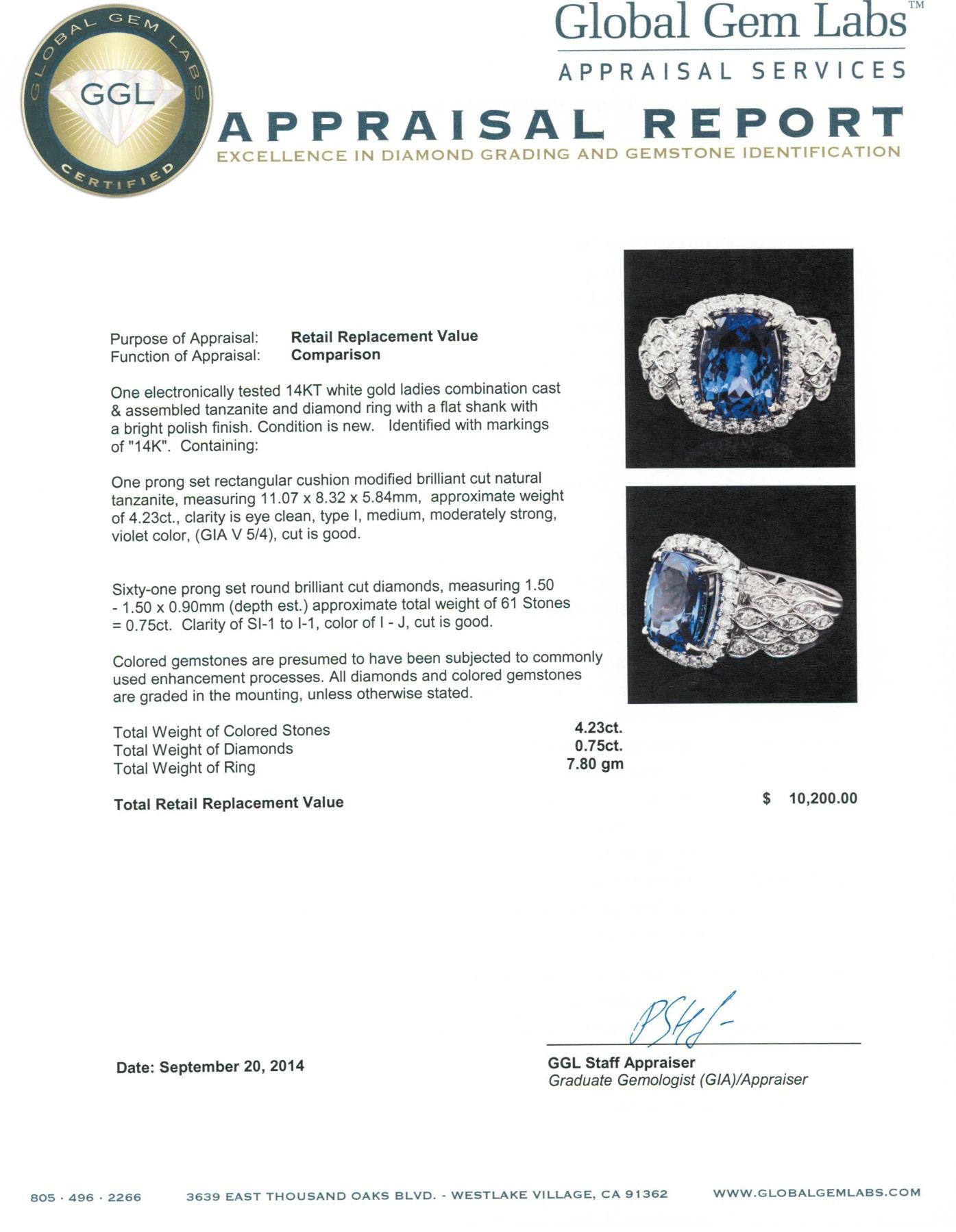 One electronically tested 14KT white gold ladies combination cast & assembled tanzanite and diamond ring with a flat shank with a bright polish finish. Identified with markings of "14K". Condition is new. Containing: One prong set rectangular cushion modified brilliant cut natural tanzanite, measuring 11.07 x 8.32 x 5.84mm, approximate weight of 4.23ct., clarity is eye clean, type I, medium, moderately strong, violet color, (GIA V 5/4), cut is good. Sixty-One prong set round brilliant cut diamonds, measuring 1.50 - 1.50 x 0.90mm (depth est.) approximate total weight of 61 Stones = 0.75ct. Clarity: SI-1 to I-1. Color: I - J, Cut is Good. Colored gemstones are presumed to have been subjected to commonly used enhancement processes. All diamonds and colored gemstones are graded in the mounting, unless otherwise stated. Total Weight of Colored Stones 4.23ct. Total Weight of Diamonds 0.75ct. Total Weight of Ring 7.80 grams. GGL Appraised.