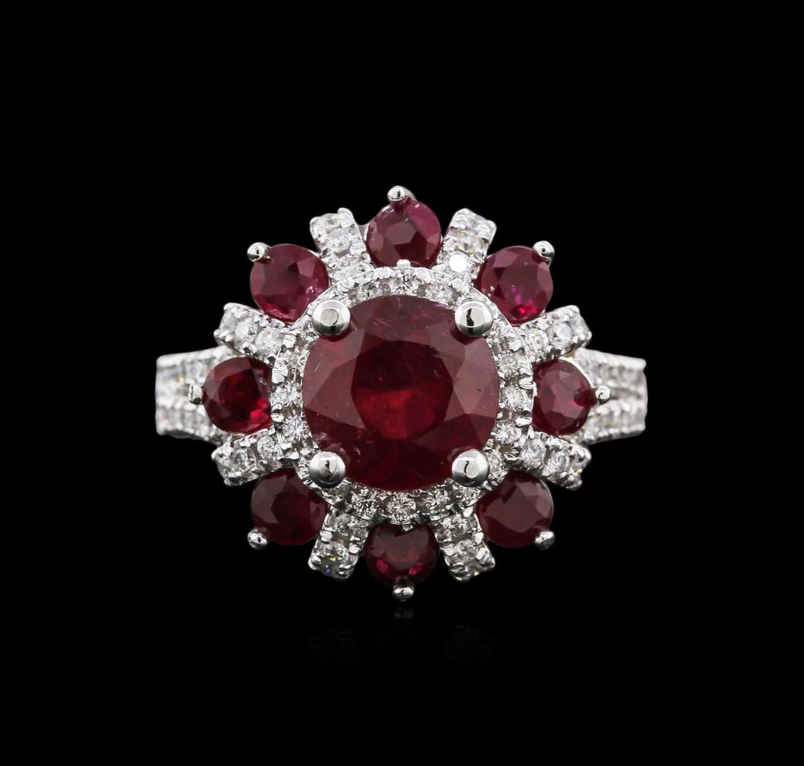 One electronically tested 14KT white gold ladies cast ruby and diamond ring with a cathedral shank with a bright polish finish. Identified with markings of "K14". Condition is new. Containing: One prong set round modified brilliant cut natural ruby, measuring 7.96 - 7.94 x 5.44 mm, exact weight 3.04ct., clarity is heavily included, type II, medium dark, moderately strong, red color, (GIA R 6/4), cut is good. Eight prong set round modified brilliant cut natural rubies, measuring 3.10 - 3.00 x 1.98 mm, exact total weight 1.20ct., clarity is moderately included, type II, medium dark, moderately strong, strongly purplish red color, (GIA stpR 6/4), cut is good. Seventy-Two prong set round brilliant cut diamonds, measuring 0.00 - 1.30 x 1.20mm (depth est.) exact total weight 72 Stones = 0.45ct. Clarity: SI-2 to I-1. Color: H - I, Cut is Good. All diamonds and colored gemstones are graded in the mounting, unless otherwise stated. Colored gemstones are presumed to have been subjected to commonly used enhancement processes. Total Weight of Colored Stones 4.24ct. Total Weight of Diamonds 0.45ct. Total Weight of Ring 7.16 grams. GGL Appraised at $3,030.00.