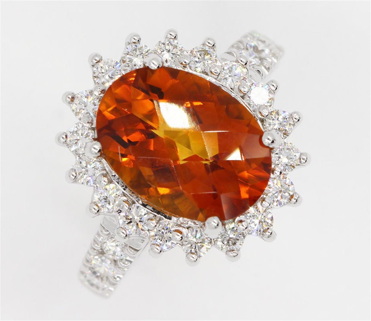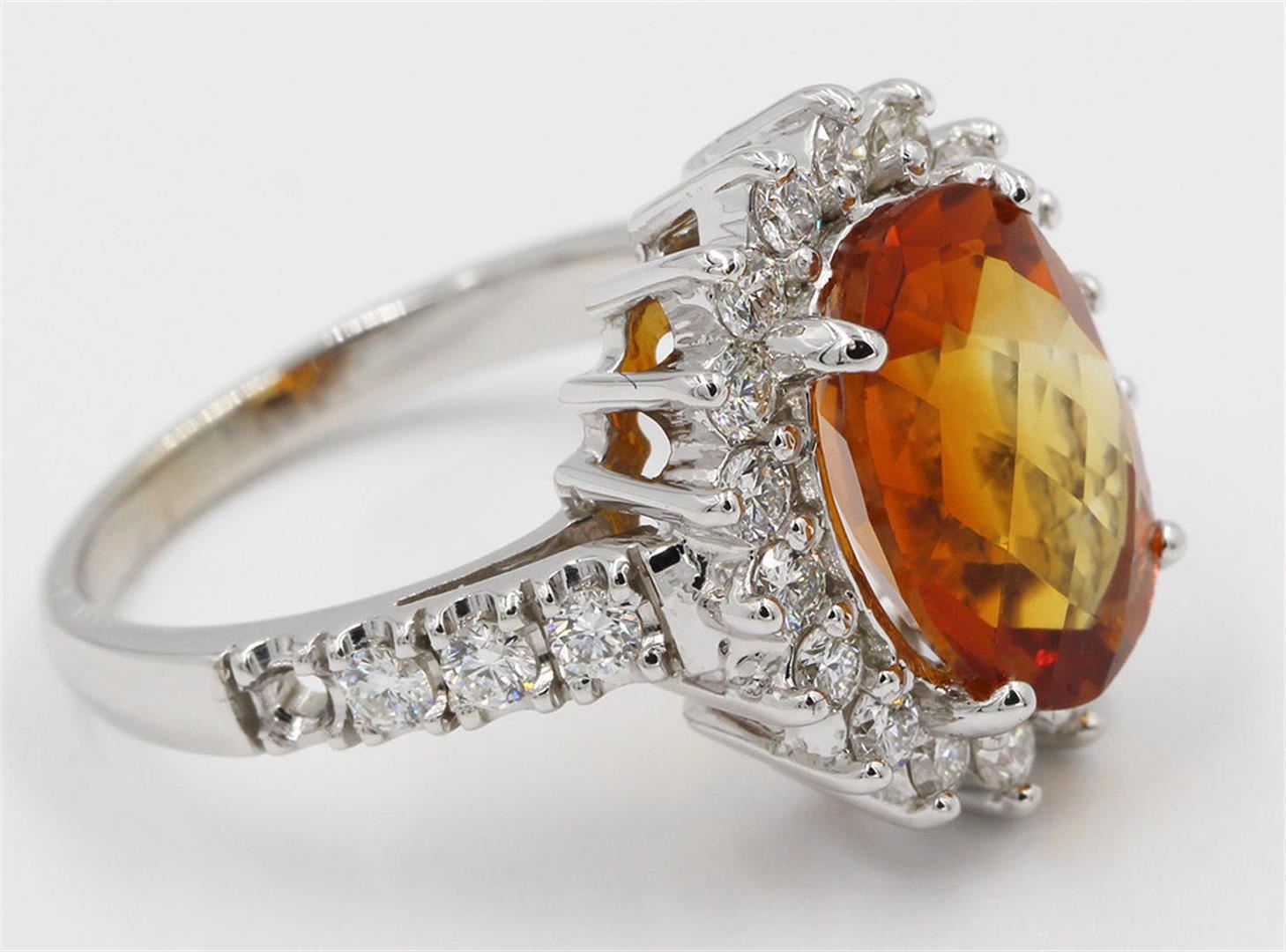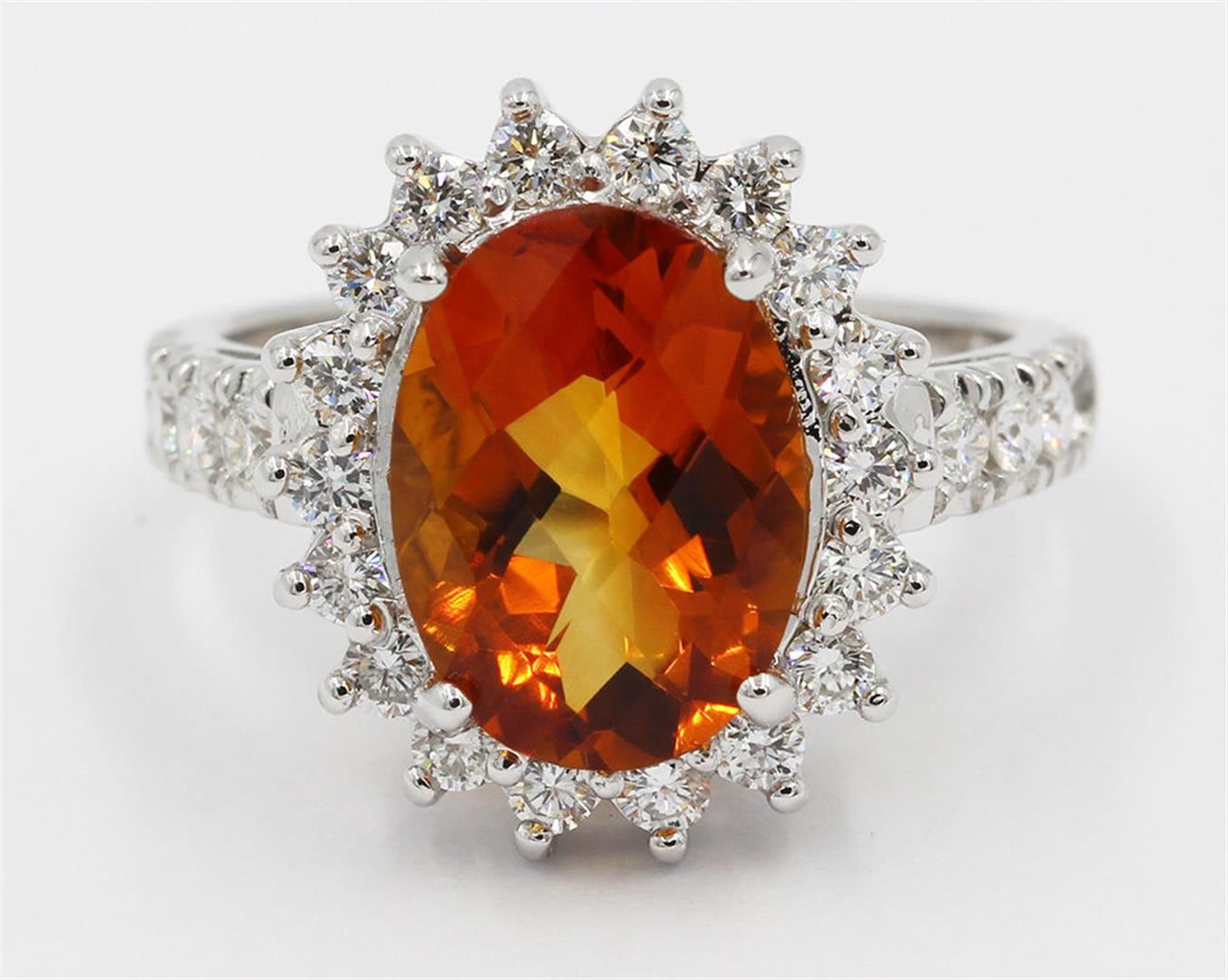 One Oval Cut Madeira Citrine Diamond Engagement Ring in 14k White Gold. Size 6.5 but can be resized. Total carat weight of the ring is 4.25 carats. Setting style is 4 prong with accent diamonds. Gross weight of gold is 5.38 grams. Total stones is 27 diamonds. Condition is brand new. Main stone treatment is natural and not enhanced. Main diamond carat is 3.47 Ct with oval brilliant shape. Main diamond has fine clarity, orange citrine color, and excellent cut. The side tone is natural and non-enhanced has a total carat weight of 0.78 Ct. Side diamond shape is round brilliant cut and has SI clarity. Side diamond color is G-H, excellent cut, totaling 26 diamonds.