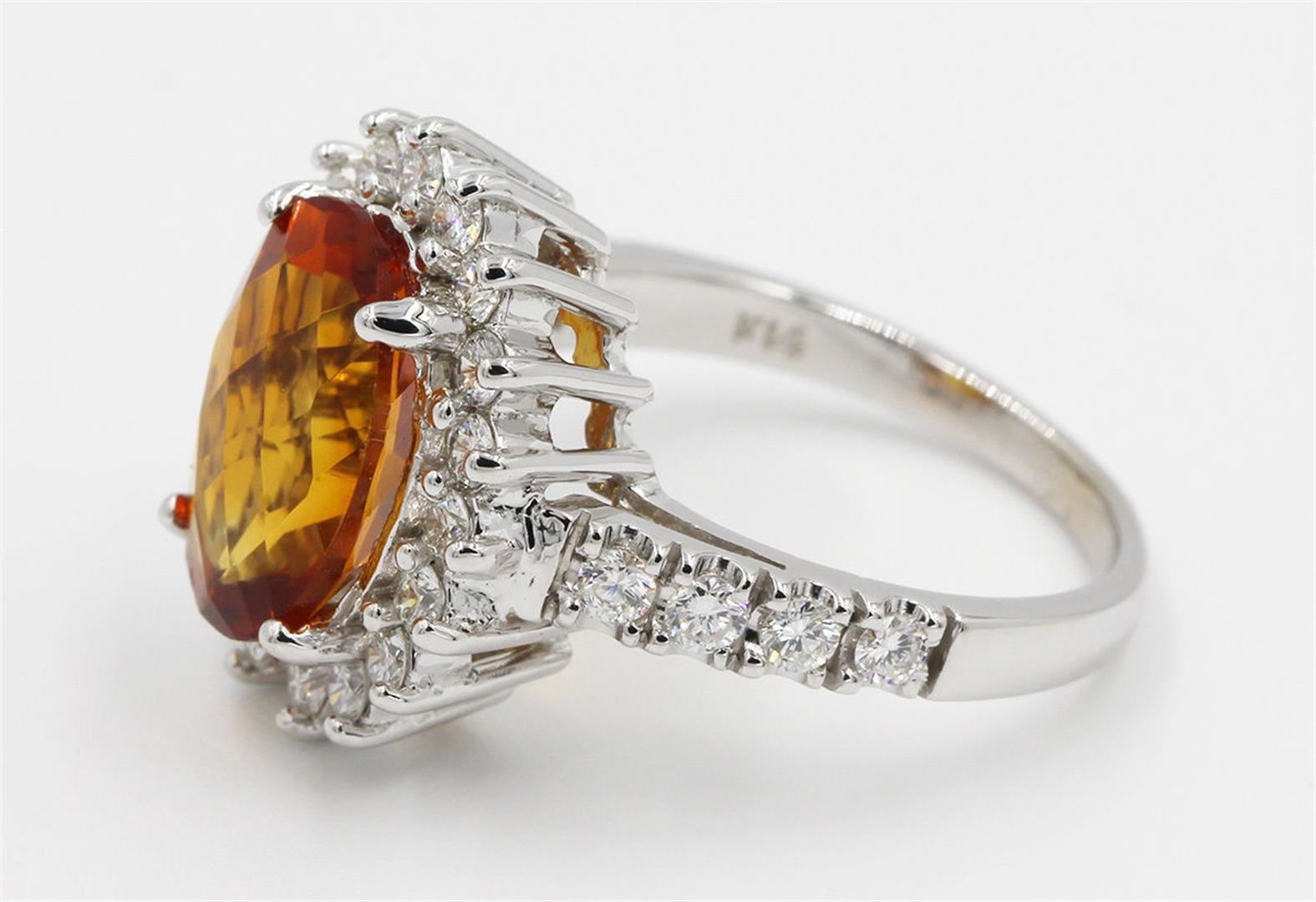 One Oval Cut Madeira Citrine Diamond Engagement Ring in 14k White Gold. Size 6.5 but can be resized. Total carat weight of the ring is 4.25 carats. Setting style is 4 prong with accent diamonds. Gross weight of gold is 5.38 grams. Total stones is 27 diamonds. Condition is brand new. Main stone treatment is natural and not enhanced. Main diamond carat is 3.47 Ct with oval brilliant shape. Main diamond has fine clarity, orange citrine color, and excellent cut. The side tone is natural and non-enhanced has a total carat weight of 0.78 Ct. Side diamond shape is round brilliant cut and has SI clarity. Side diamond color is G-H, excellent cut, totaling 26 diamonds.