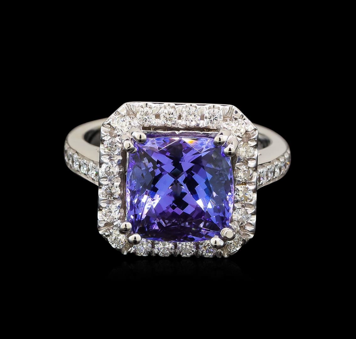 One electronically tested 14KT white gold ladies cast tanzanite and diamond ring with a bright polish finish. Identified with markings of "K14". Condition is new. Containing: One prong set square cushion modified brilliant cut natural tanzanite, measuring 9.40 x 9.40 x 6.11mm, approximate weight of 4.25ct., clarity is eye clean, type I, medium light, very slightly grayish, violet color, (GIA V 4/3), cut is good. Fifty prong set round brilliant cut diamonds, measuring 1.30 - 1.30 x 0.78mm (depth est.) approximate total weight of 50 Stones = 0.40ct. Clarity: SI-1 to I-1. Color: H - I, Cut is Good. Colored gemstones are presumed to have been subjected to commonly used enhancement processes. All diamonds and colored gemstones are graded in the mounting, unless otherwise stated. Total Weight of Colored Stones 4.25ct. Total Weight of Diamonds 0.40ct. Total Weight of Ring 7.40 grams. GGL Appraised at $5,170.00.