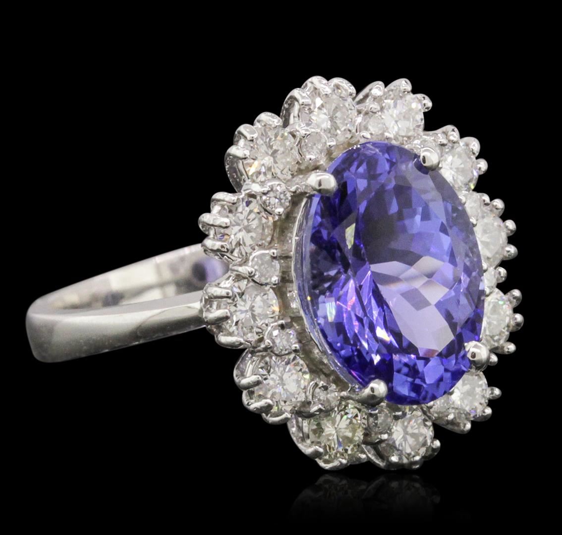 One electronically tested 14KT white gold ladies combination cast & assembled ring with a bright polish finish. Condition is new. Identified with markings of "K14". Containing: One prong set oval modified brilliant cut natural tanzanite, measuring 11.62 x 8.55 x 6.23mm, approximate weight of 4.25ct., clarity is eye clean, type I, medium, moderately strong, bluish violet color, (GIA bV 5/4), cut is good. Twelve prong set round brilliant cut diamonds, measuring 2.50 - 2.50 x 1.50mm (depth est.) approximate. Total Weight of 12 Stones = 0.69ct. Clarity: SI-1 to SI-2. Color: K - L, Cut is Good. Twelve prong set round brilliant cut diamonds, measuring 1.30 - 1.30 x 0.78mm (depth est.) approximate. Total Weight of 12 Stones = 0.10 ct. Clarity: I-2. Color: H - I, Cut is Good. Colored gemstones are presumed to have been subjected to commonly used enhancement processes. All diamonds and colored gemstones are graded in the mounting, unless otherwise stated. Total Weight of Colored Stones 4.25ct. Total Weight of Diamonds 0.78ct. Total Weight of Ring 6.00 grams. GGL Appraised.