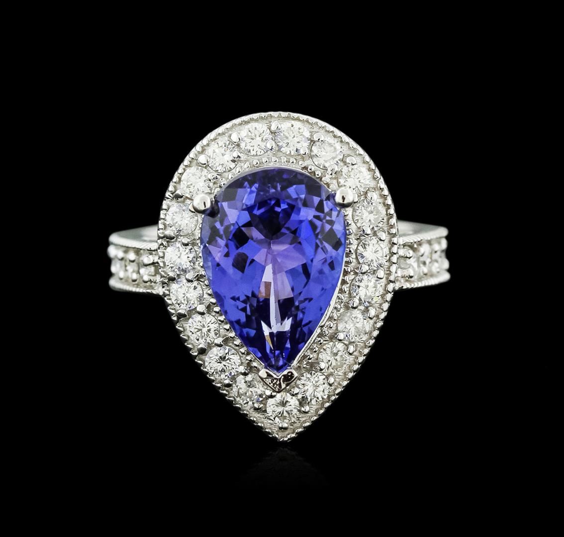 One electronically tested 14KT white gold ladies cast tanzanite and diamond ring with a bright polish finish. Identified with markings of "K14". Condition is new. Containing: One prong set pear modified brilliant cut natural tanzanite, measuring 13.00 x 8.90 x 5.50mm, approximate weight of 4.26ct., clarity is eye clean, type I, medium light, very slightly grayish, violet color, (GIA V 4/3), cut is good. Twenty-Nine prong set round brilliant cut diamonds, measuring 2.00 - 2.00 x 1.20mm (depth est.) approximate total weight of 29 Stones = 0.85ct. Clarity: SI-1 to SI-2. Color: H - I, Cut is Good. Colored gemstones are presumed to have been subjected to commonly used enhancement processes. All diamonds and colored gemstones are graded in the mounting, unless otherwise stated. Total Weight of Colored Stones 4.26ct. Total Weight of Diamonds 0.85ct. Total Weight of Ring 7.30 grams. GGL Appraised at $5,995.00.