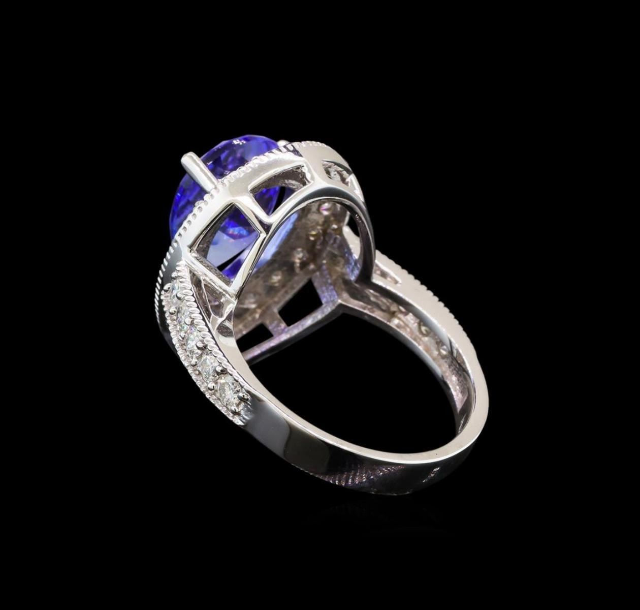 One electronically tested 14KT white gold ladies cast tanzanite and diamond ring with a bright polish finish. Identified with markings of "K14". Condition is new. Containing: One prong set pear modified brilliant cut natural tanzanite, measuring 13.00 x 8.90 x 5.50mm, approximate weight of 4.26ct., clarity is eye clean, type I, medium light, very slightly grayish, violet color, (GIA V 4/3), cut is good. Twenty-Nine prong set round brilliant cut diamonds, measuring 2.00 - 2.00 x 1.20mm (depth est.) approximate total weight of 29 Stones = 0.85ct. Clarity: SI-1 to SI-2. Color: H - I, Cut is Good. Colored gemstones are presumed to have been subjected to commonly used enhancement processes. All diamonds and colored gemstones are graded in the mounting, unless otherwise stated. Total Weight of Colored Stones 4.26ct. Total Weight of Diamonds 0.85ct. Total Weight of Ring 7.30 grams. GGL Appraised at $5,995.00.