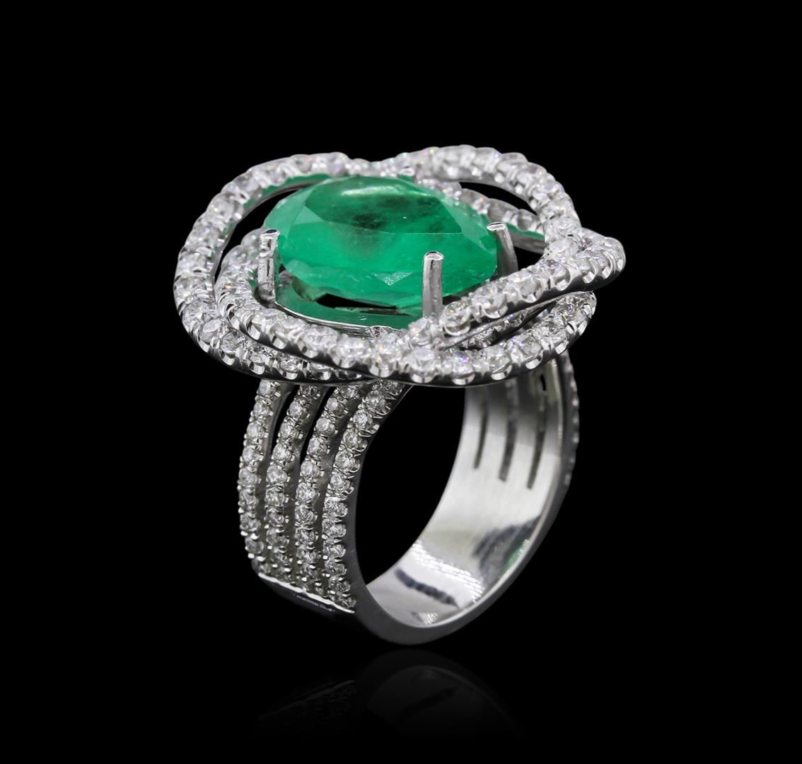 One electronically tested 14KT white gold ladies cast emerald and diamond ring with a bright polish finish. Identified with markings of "14K". Condition is new. Containing: One prong set pear modified brilliant cut natural emerald, measuring 14.40 x 10.90 x 5.00mm, approximate weight of 4.27ct., clarity is heavily included, type III, medium light, very slightly grayish, green color, (GIA G 4/3), cut is good. One Hundred Ninety-Seven prong set round brilliant cut diamonds, measuring 1.80 - 1.50 x 0.99mm (depth est.) approximate. Total Weight of 197 Stones = 3.23ct. Clarity: SI-2 to I-2. Color: I - J, Cut is Good. Colored gemstones are presumed to have been subjected to commonly used enhancement processes. All diamonds and colored gemstones are graded in the mounting, unless otherwise stated. Total Weight of Colored Stones 4.27ct. Total Weight of Diamonds 3.23ct. Total Weight of Ring 12.30 grams. GGL Appraised at $8,105.00.