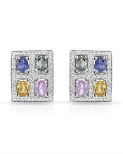 14KT White Gold 4.27ctw Multi Color Sapphire and Diamond Earrings. (8) Multi color sapphires with a total weight of 4.27cts. (126) Round Diamonds with a total weight of 1.13cts with a color of I and clarity of I-1. Measuring 19mm x 16mm. Total weight of these earrings are 11.85 grams.