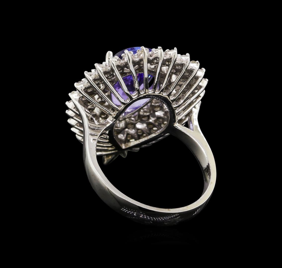 One electronically tested 14KT white gold ladies cast tanzanite and diamond ring with a bright polish finish. Identified with markings of "K14". Condition is new. Containing: One prong set pear modified brilliant cut natural tanzanite, measuring 13.60 x 8.00 x 5.89mm, approximate weight of 4.29ct., clarity is eye clean, type I, medium light, very slightly grayish, violet color, (GIA V 4/3), cut is good. One Hundred Two prong set round brilliant cut diamonds, measuring 1.50 - 1.30 x 0.84mm (depth est.) approximate total weight of 102 Stones = 1.02ct. Clarity: SI-2 to I-2. Color: J, Cut is Good. Colored gemstones are presumed to have been subjected to commonly used enhancement processes. All diamonds and colored gemstones are graded in the mounting, unless otherwise stated. Total Weight of Colored Stones 4.29ct. Total Weight of Diamonds 1.02ct. Total Weight of Ring 8.70 grams. GGL Appraised at $6,525.00.