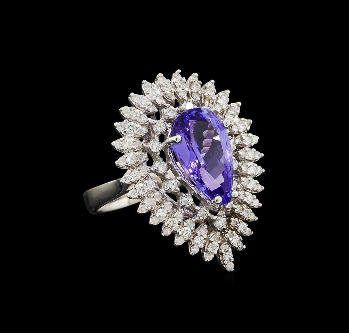 One electronically tested 14KT white gold ladies cast tanzanite and diamond ring with a bright polish finish. Identified with markings of "K14". Condition is new. Containing: One prong set pear modified brilliant cut natural tanzanite, measuring 13.60 x 8.00 x 5.89mm, approximate weight of 4.29ct., clarity is eye clean, type I, medium light, very slightly grayish, violet color, (GIA V 4/3), cut is good. One Hundred Two prong set round brilliant cut diamonds, measuring 1.50 - 1.30 x 0.84mm (depth est.) approximate total weight of 102 Stones = 1.02ct. Clarity: SI-2 to I-2. Color: J, Cut is Good. Colored gemstones are presumed to have been subjected to commonly used enhancement processes. All diamonds and colored gemstones are graded in the mounting, unless otherwise stated. Total Weight of Colored Stones 4.29ct. Total Weight of Diamonds 1.02ct. Total Weight of Ring 8.70 grams. GGL Appraised at $6,525.00.