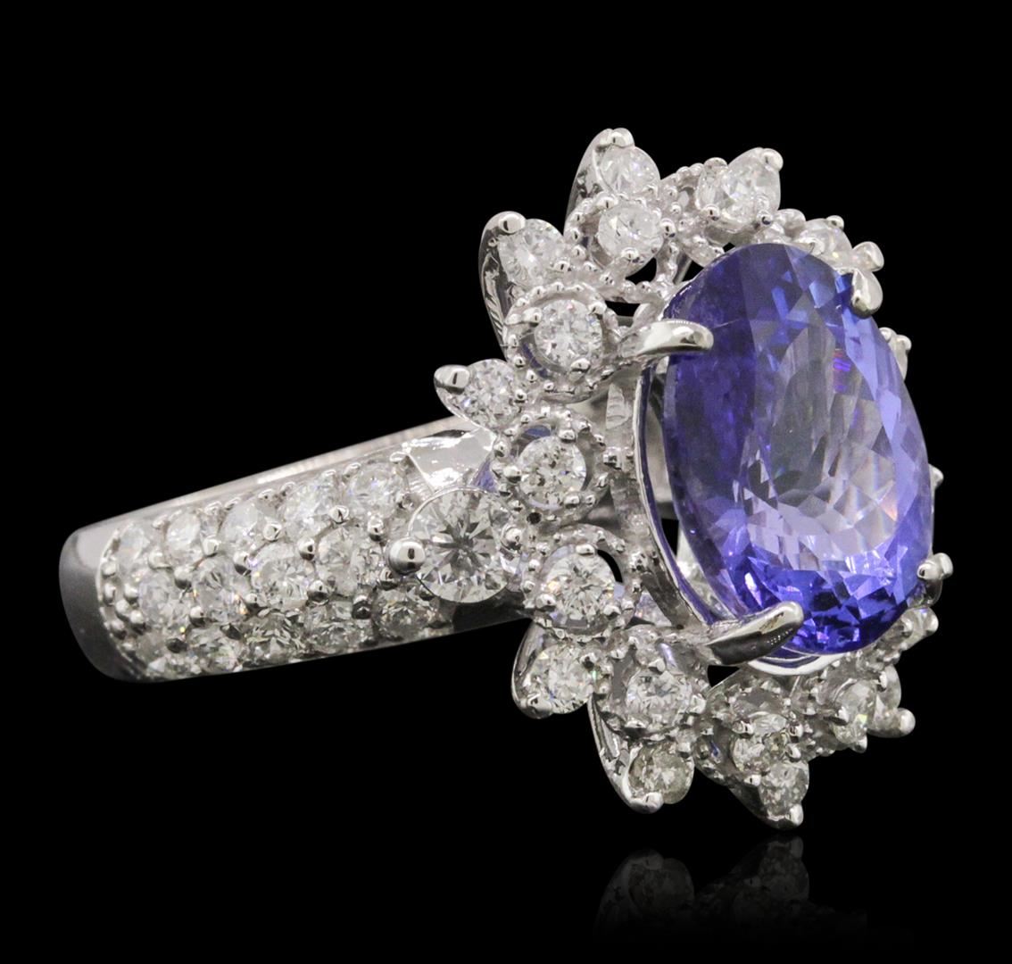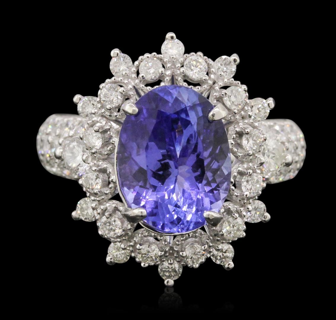 One electronically tested 14KT white gold ladies cast tanzanite and diamond ring. Condition is new, good workmanship. The featured tanzanite is set within a stylized diamond bezel supported by diamond set shoulders, completed by a three and one-half millimeter wide band. Bright polish finish with milgrain detailing. Identified with markings of "K14". Containing: One prong set oval brilliant cut natural tanzanite, measuring 11.40 x 8.70 x 6.00mm, 6%. bulge factor, approximate weight of 4.30ct., clarity is eye clean, type I, medium dark, very slightly grayish, bluish violet color, (GIA bV 6/3), cut is good. Transmitting light with no distortion, transparent. Graded in the setting.Tanzanite is a very rare gemstone that is only found in the country of Tanzania. Originally discovered in 1967. Tiffany & Company, named the stone Tanzanite. It is found in the Usumburu Mountains that border the Umba Valley of northern Tanzania. Tanzanite occurs in gray, brown, violet, blue, reddish-purple, & green. The gem is interesting because of its exceptional pleochroism. Rotated in different directions a tanzanite will exhibit multiple changes of color. Tanzanite has a low tolerance to ultrasonic cleaning, and should not be cleaned using this method.Fifty-Two prong set round brilliant cut diamonds, measuring 1.90 - 1.80 x 1.11mm (depth est.) approximate. Total Weight of 52 Stones = 1.30ct. Graded in the setting. Clarity: I-1 to I-2. Color: H - J. Total Weight of Colored Stones 4.30ct. Total Weight of Diamonds 1.30ct. Total Weight of Ring 6.64gm. AIG Appraised at $14,780.00.