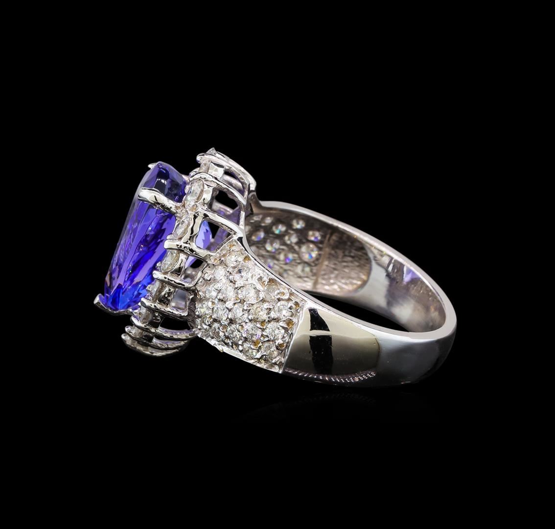 One electronically tested 14KT white gold ladies cast tanzanite and diamond ring with a bright polish finish. Identified with markings of "14K". Condition is new. Containing: One prong set pear modified brilliant cut natural tanzanite, measuring 12.50 x 8.90 x 5.79mm, approximate weight of 4.32ct., clarity is eye clean, type I, medium light, very slightly grayish, violet color, (GIA V 4/3), cut is good. Fifty-One prong set round brilliant cut diamonds, measuring 2.50 - 1.30 x 1.14mm (depth est.) approximate total weight of 51 Stones = 1.28ct. Clarity: SI-1 to I-1. Color: I - J. All diamonds and colored gemstones are graded in the mounting, unless otherwise stated. Colored gemstones are presumed to have been subjected to commonly used enhancement processes. Total Weight of Colored Stones 4.32ct. Total Weight of Diamonds 1.28ct. Total Weight of Ring 6.00. grams. GGL Appraised at $7,255.00.