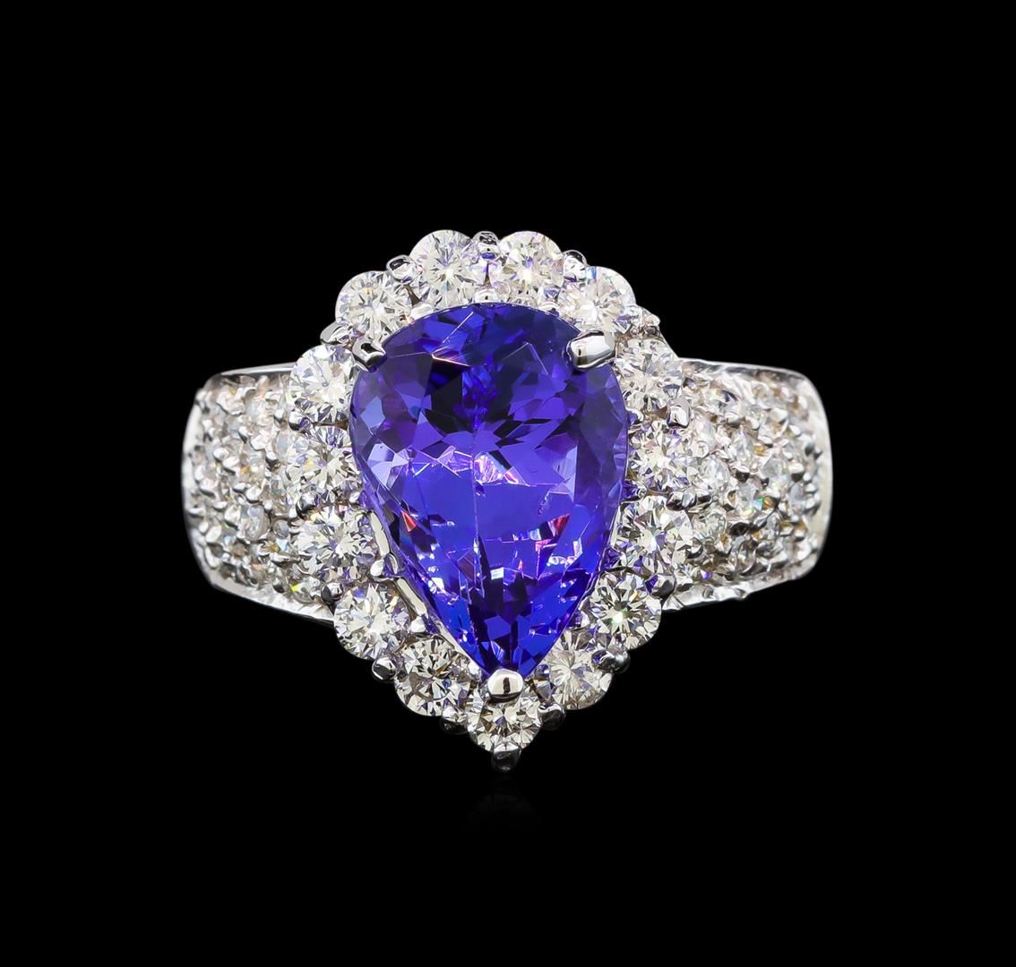 One electronically tested 14KT white gold ladies cast tanzanite and diamond ring with a bright polish finish. Identified with markings of "14K". Condition is new. Containing: One prong set pear modified brilliant cut natural tanzanite, measuring 12.50 x 8.90 x 5.79mm, approximate weight of 4.32ct., clarity is eye clean, type I, medium light, very slightly grayish, violet color, (GIA V 4/3), cut is good. Fifty-One prong set round brilliant cut diamonds, measuring 2.50 - 1.30 x 1.14mm (depth est.) approximate total weight of 51 Stones = 1.28ct. Clarity: SI-1 to I-1. Color: I - J. All diamonds and colored gemstones are graded in the mounting, unless otherwise stated. Colored gemstones are presumed to have been subjected to commonly used enhancement processes. Total Weight of Colored Stones 4.32ct. Total Weight of Diamonds 1.28ct. Total Weight of Ring 6.00. grams. GGL Appraised at $7,255.00.
