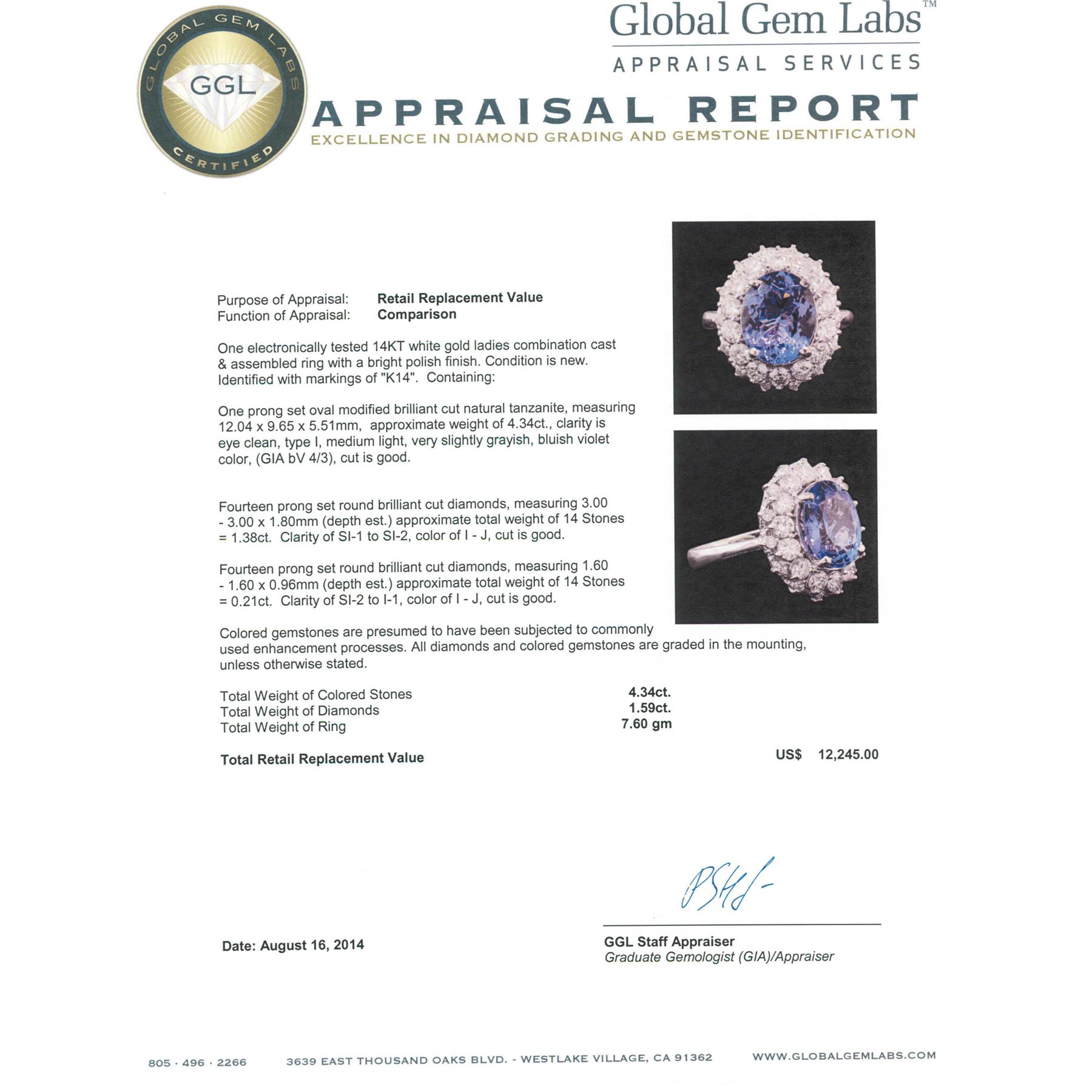 One electronically tested 14KT white gold ladies combination cast & assembled ring with a bright polish finish. Condition is new. Identified with markings of "K14". Containing: One prong set oval modified brilliant cut natural tanzanite, measuring 12.04 x 9.65 x 5.51mm, approximate weight of 4.34ct., clarity is eye clean, type I, medium light, very slightly grayish, bluish violet color, (GIA bV 4/3), cut is good. Fourteen prong set round brilliant cut diamonds, measuring 3.00 - 3.00 x 1.80mm (depth est.) approximate. Total Weight of 14 Stones = 1.38ct. Clarity: SI-1 to SI-2. Color: I - J, Cut is Good. Fourteen prong set round brilliant cut diamonds, measuring 1.60 - 1.60 x 0.96mm (depth est.) approximate. Total Weight of 14 Stones = 0.21ct. Clarity: SI-2 to I-1. Color: I - J, Cut is Good. Colored gemstones are presumed to have been subjected to commonly used enhancement processes. All diamonds and colored gemstones are graded in the mounting, unless otherwise stated. Total Weight of Colored Stones 4.34ct. Total Weight of Diamonds 1.59ct. Total Weight of Ring 7.60 grams. GGL Appraised at $12,245.00.