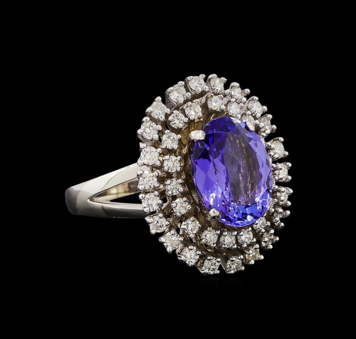 One electronically tested 14KT white gold ladies cast tanzanite and diamond ring with a bright polish finish. The featured tanzanite is set within a two tiered diamond bezel, completed by a three millimeter wide band. Identified with markings of "K14". Condition is new, good workmanship. Containing: One prong set oval mixed cut natural tanzanite, measuring 12.55 x 9.55 x 5.00mm, 6% bulge factor, approximate weight of 4.34ct., clarity is eye clean, type I, medium dark, very slightly grayish, bluish violet color, (GIA bV 6/3), cut is good. Transmitting light with no distortion, transparent. Graded in the setting. Tanzanite is a very rare gemstone that is only found in the country of Tanzania. Originally discovered in 1967. Tiffany & Company, named the stone Tanzanite. It is found in the Usumburu Mountains that border the Umba Valley of northern Tanzania. Tanzanite occurs in gray, brown, violet, blue, reddish-purple, & green. The gem is interesting because of its exceptional pleochroism. Rotated in different directions a tanzanite will exhibit multiple changes of color. Tanzanite has a low tolerance to ultrasonic cleaning, and should not be cleaned using this method. Forty prong set round brilliant cut diamonds, measuring 2.00 - 1.90 x 1.17mm (depth est.) approximate total weight of 40 Stones = 1.18ct. Graded in the setting. Clarity: SI-1 to I-1. Color: H - J. Total Weight of Colored Stones 4.34ct. Total Weight of Diamonds 1.18ct. Total Weight of Ring 12.10 grams. AIG Appraised at $15,420.00.