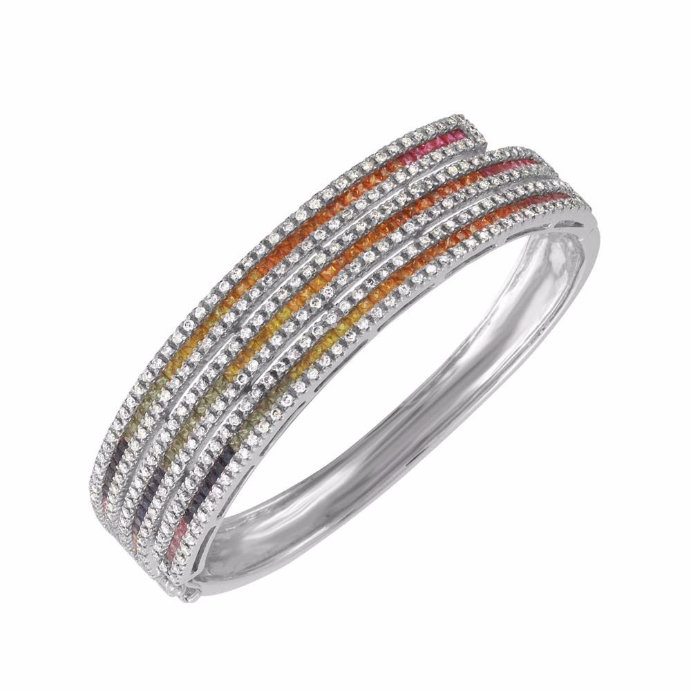 One 14KT White Gold 4.34ctw Multi Color Sapphire and Diamond Bracelet. (138) Multi color Sapphires with a total weight of 4.34cts. (268) Diamonds with a total weight of 2.15cts with a color of I and a clarity of I-1 to I-2. Total weight of this bracelet is 4.34 grams.