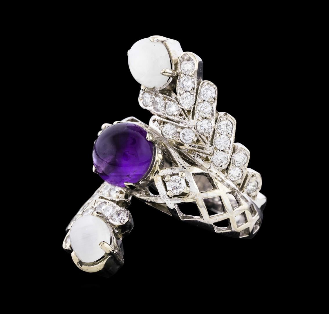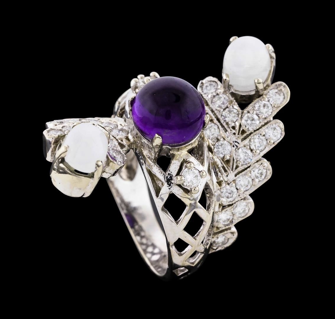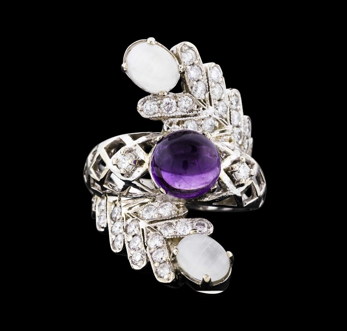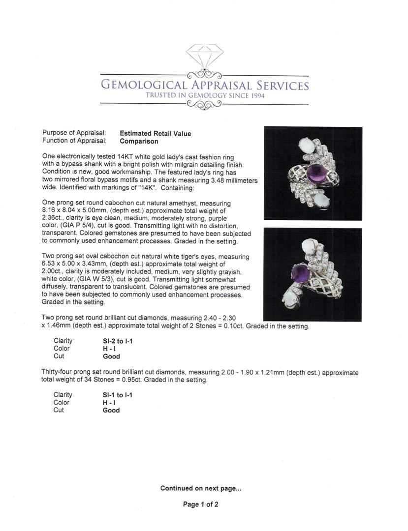 One electronically tested 14KT white gold lady's cast fashion ring with a bypass shank with a bright polish with milgrain detailing finish. The featured lady's ring has two mirrored floral bypass motifs and a shank measuring 3.48 millimeters wide. Identified with markings of "14K". Condition is new, good workmanship. Containing: One prong set round cabochon cut natural amethyst, measuring 8.16 x 8.04 x 5.00mm, (depth est.) approximate total weight of 2.36ct., clarity is eye clean, medium, moderately strong, purple color, (GIA P 5/4), cut is good. Transmitting light with no distortion, transparent. Colored gemstones are presumed to have been subjected to commonly used enhancement processes. Graded in the setting. Two prong set oval cabochon cut natural white tiger's eyes, measuring 6.53 x 5.00 x 3.43mm, (depth est.) approximate total weight of 2.00ct., clarity is moderately included, medium, very slightly grayish, white color, (GIA W 5/3), cut is good. Transmitting light somewhat diffusely, transparent to translucent. Colored gemstones are presumed to have been subjected to commonly used enhancement processes. Graded in the setting. Two prong set round brilliant cut diamonds, measuring 2.40 - 2.30 x 1.46mm (depth est.) approximate total weight of 2 Stones = 0.10ct. Graded in the setting. Clarity: SI-2 to I-1. Color: H - ICut Good Thirty-Four prong set round brilliant cut diamonds, measuring 2.00 - 1.90 x 1.21mm (depth est.) approximate total weight of 34 Stones = 0.95ct. Graded in the setting. Clarity: SI-1 to I-1. Color: H - ICut Good. Total Weight of Colored Stones 4.36ct. Total Weight of Diamonds 1.05ct. Total Weight of Ring 9.90gm. GAS Appraised.