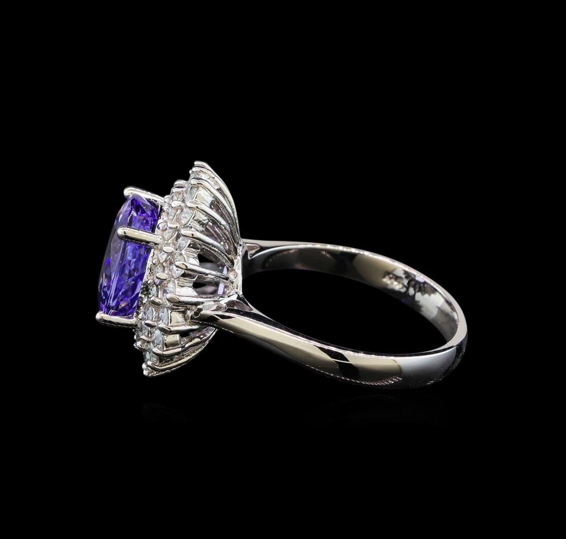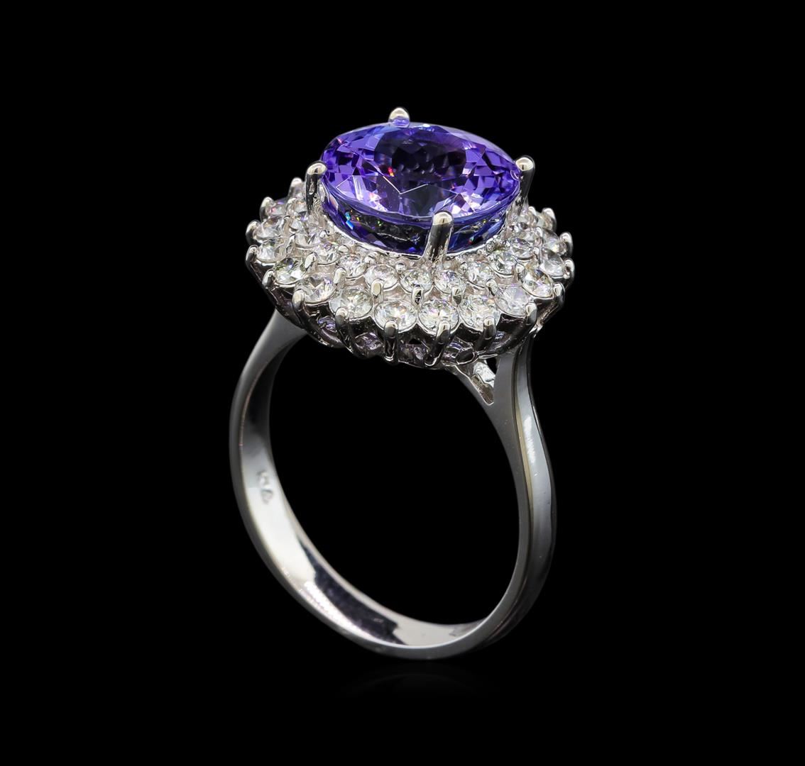 One electronically tested 14KT white gold ladies cast tanzanite and diamond ring with a bright polish finish. Identified with markings of "14K". Condition is new. Containing: One prong set round modified brilliant cut natural tanzanite, measuring 10.00. - 10.00. x 6.50 mm, approximate weight of 4.36ct., clarity is eye clean, type I, medium light, very slightly grayish, violet color, (GIA V 4/3), cut is good. Forty prong set round brilliant cut diamonds, measuring 2.00. - 1.50 x 1.05mm (depth est.) approximate total weight of 40 Stones = 0.78ct. Clarity: SI-1 to I-1. Color: I - J, Cut is Good. Colored gemstones are presumed to have been subjected to commonly used enhancement processes. All diamonds and colored gemstones are graded in the mounting, unless otherwise stated. Total Weight of Colored Stones 4.36ct. Total Weight of Diamonds 0.78ct. Total Weight of Ring 6.50 grams. GGL Appraised at $5,125.00.