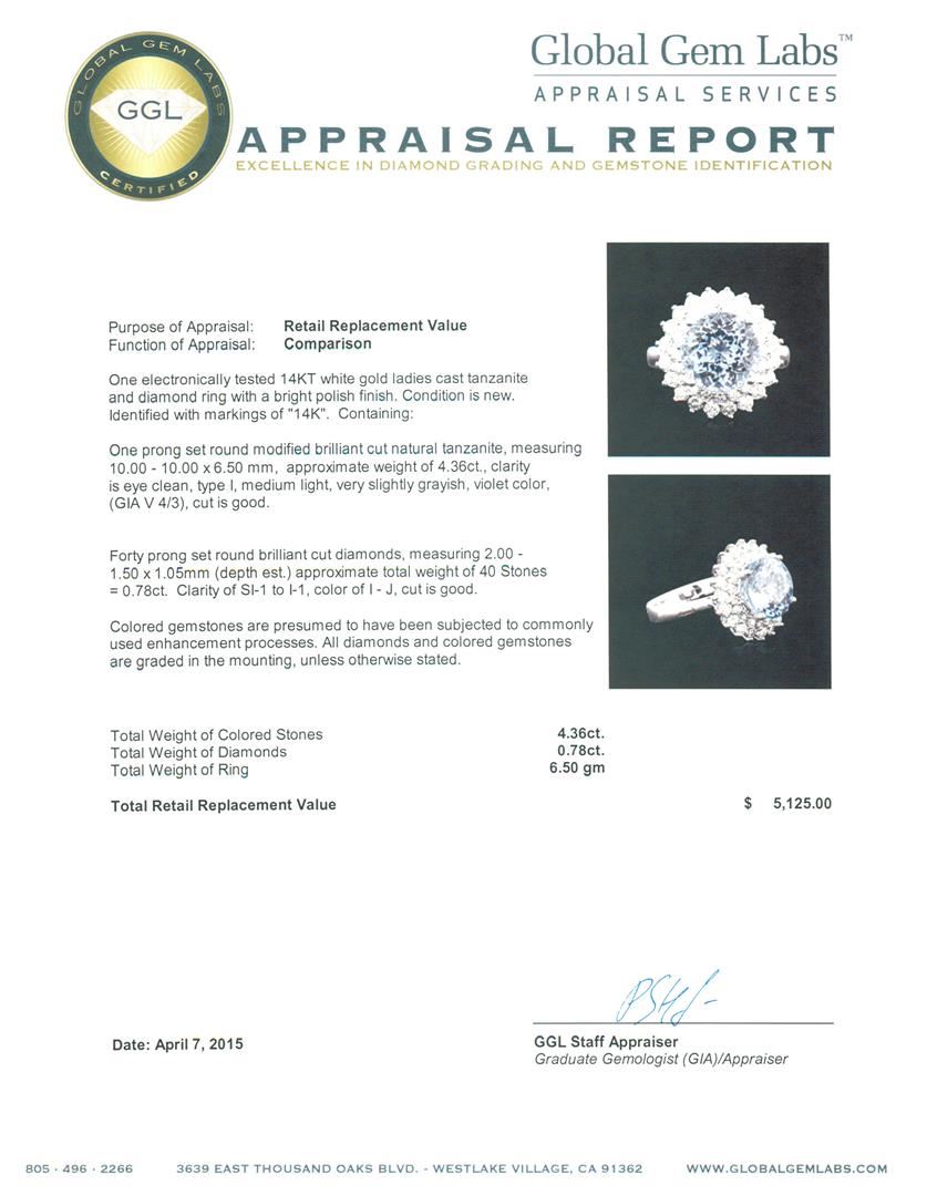 One electronically tested 14KT white gold ladies cast tanzanite and diamond ring with a bright polish finish. Identified with markings of "14K". Condition is new. Containing: One prong set round modified brilliant cut natural tanzanite, measuring 10.00. - 10.00. x 6.50 mm, approximate weight of 4.36ct., clarity is eye clean, type I, medium light, very slightly grayish, violet color, (GIA V 4/3), cut is good. Forty prong set round brilliant cut diamonds, measuring 2.00. - 1.50 x 1.05mm (depth est.) approximate total weight of 40 Stones = 0.78ct. Clarity: SI-1 to I-1. Color: I - J, Cut is Good. Colored gemstones are presumed to have been subjected to commonly used enhancement processes. All diamonds and colored gemstones are graded in the mounting, unless otherwise stated. Total Weight of Colored Stones 4.36ct. Total Weight of Diamonds 0.78ct. Total Weight of Ring 6.50 grams. GGL Appraised at $5,125.00.
